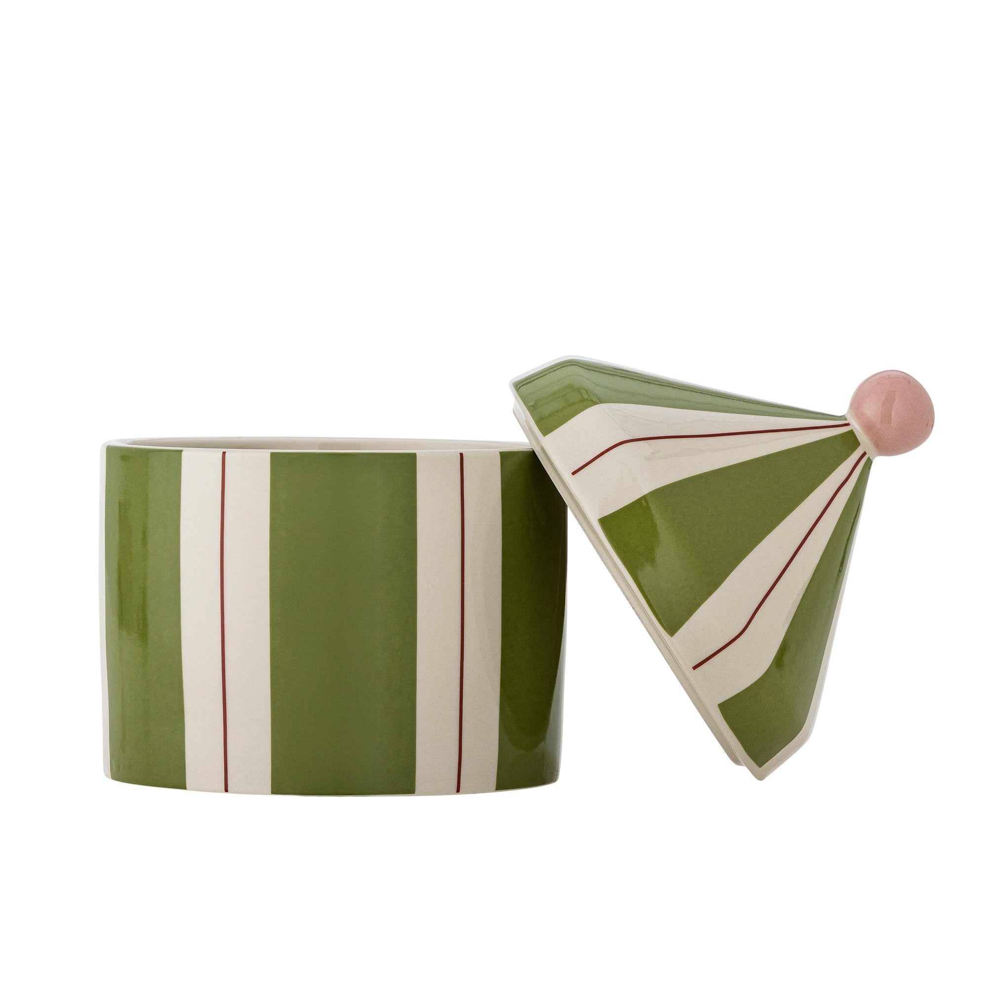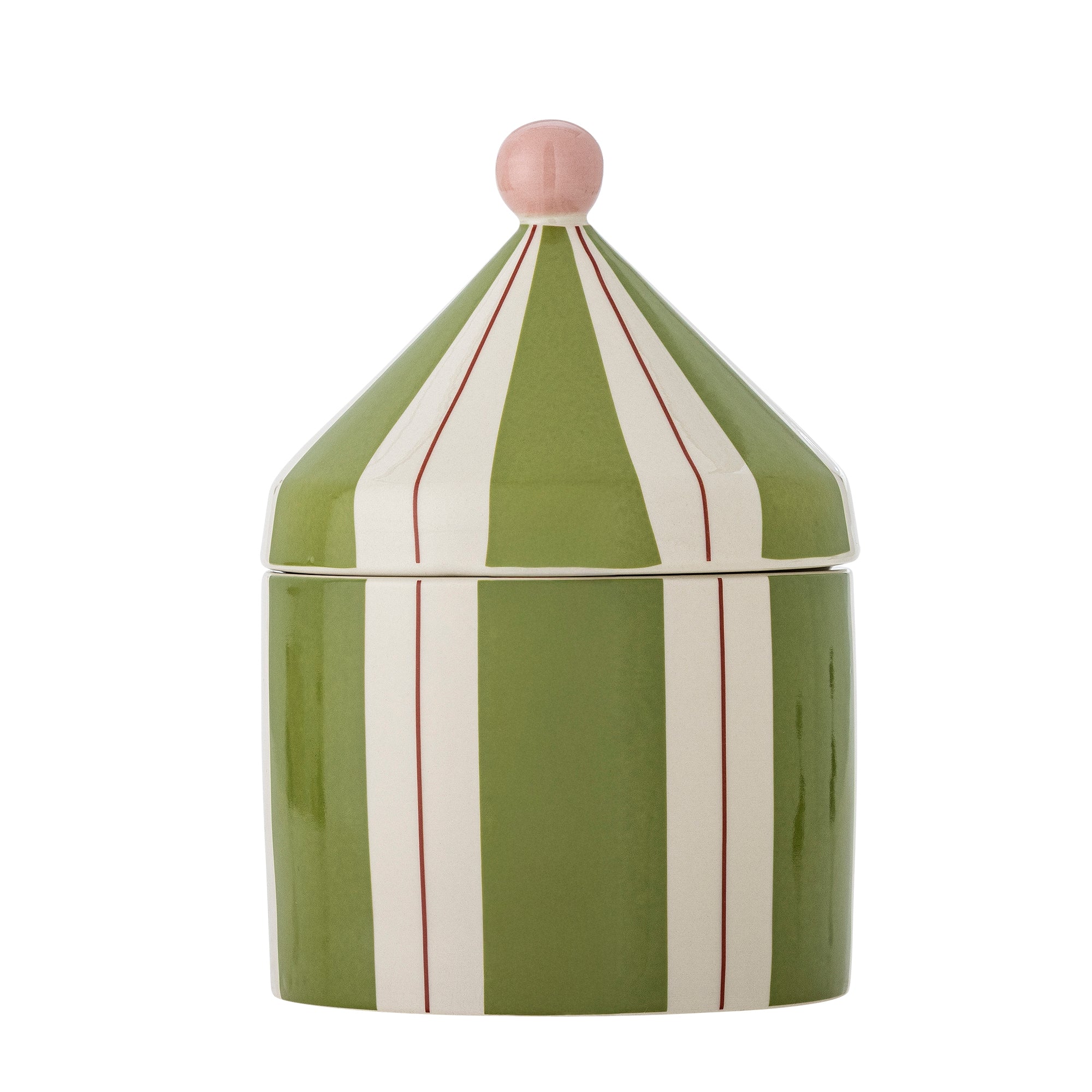 El contenedor de almacenamiento tiene la bonita forma de una carpa de circo y está fabricado en gres con rayas verdes y blancas.