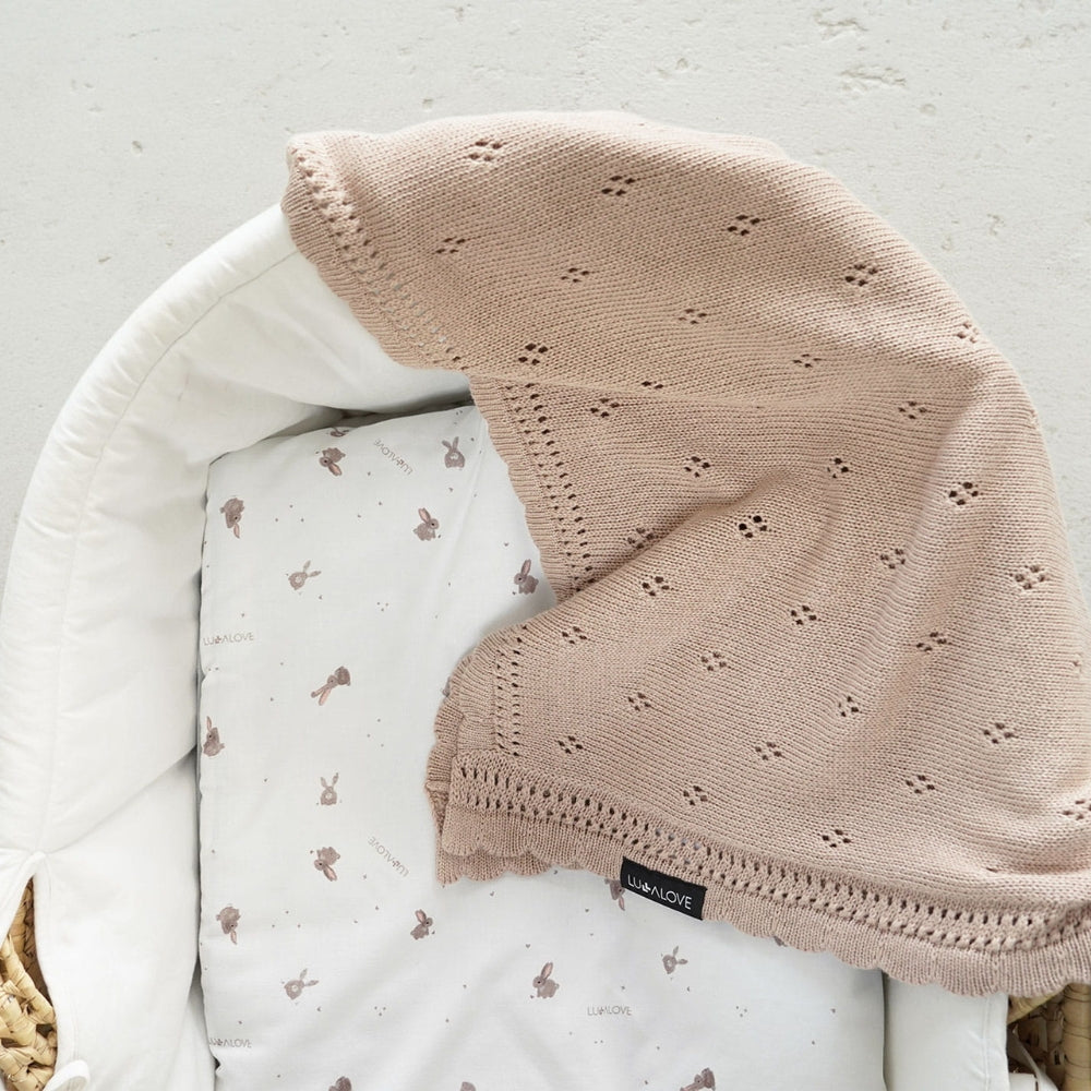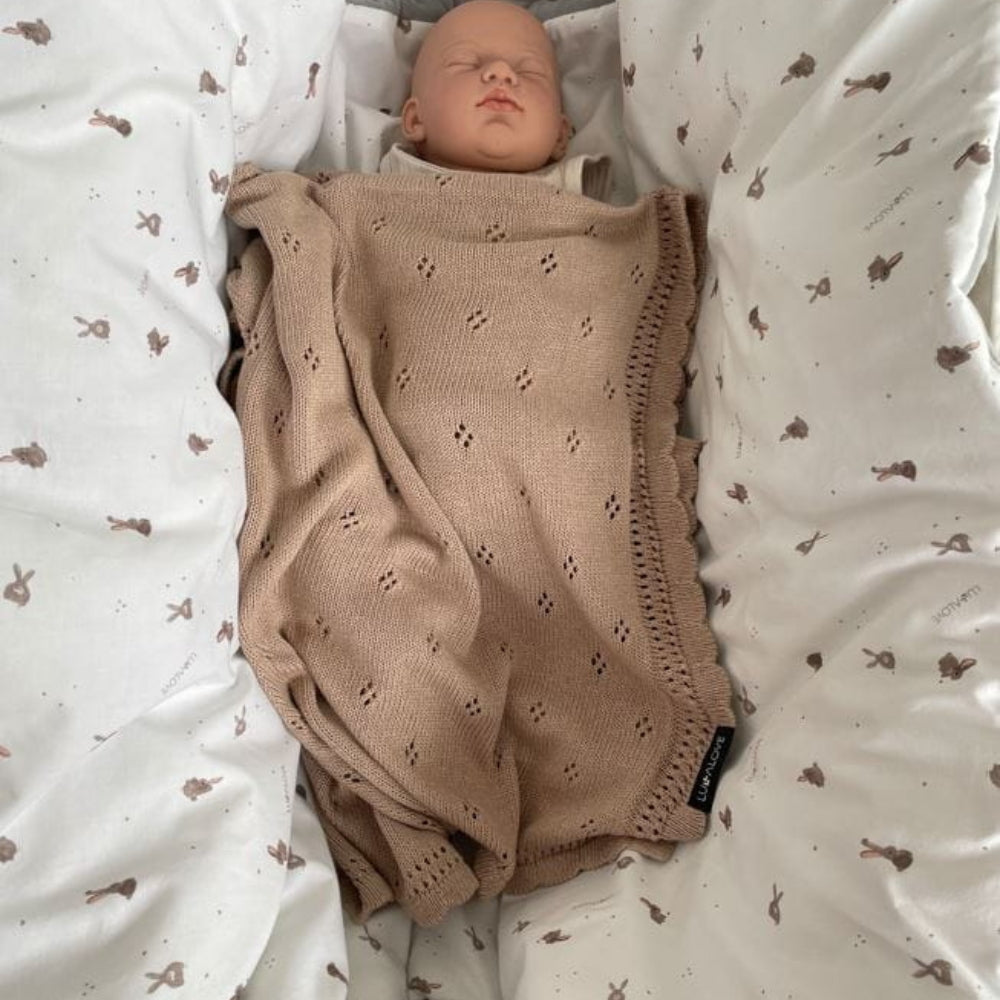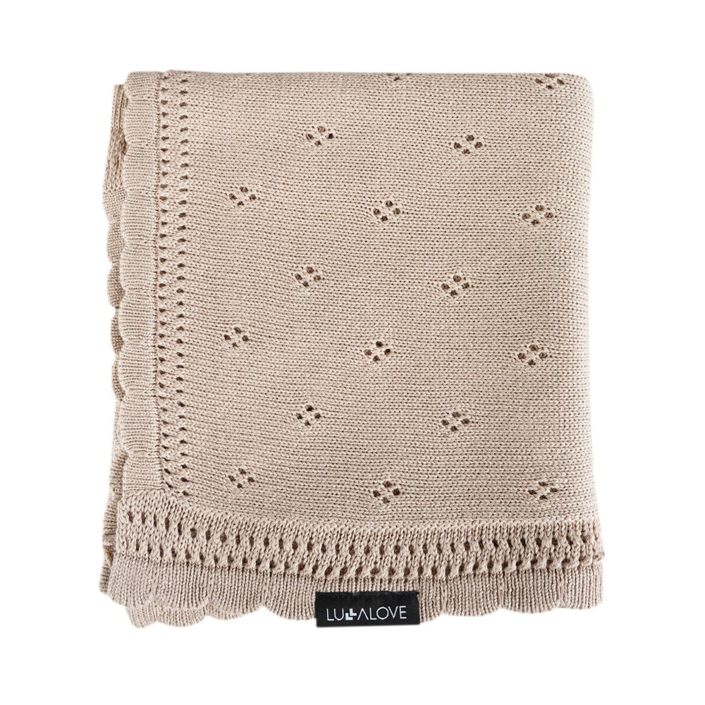 Preciosa mantita para bebé con margaritas caladas en color beige caramelo de Lullalove.