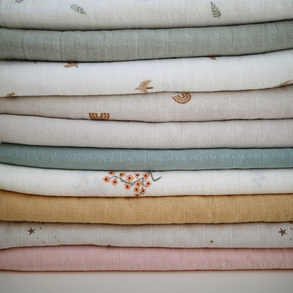 La manta de muselina de la marca Mushie es 100 % algodón orgánico, el más saludable y suave para la piel sensible del bebé.