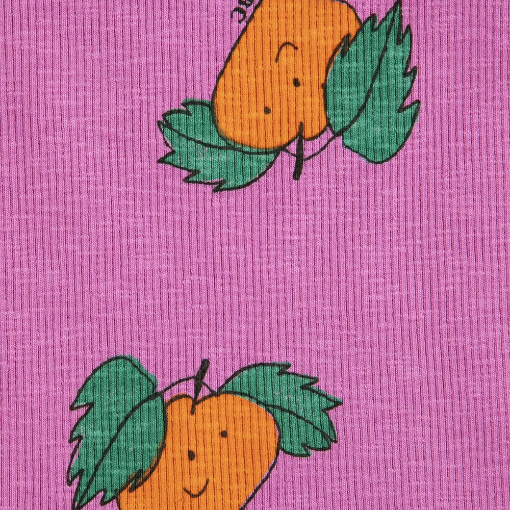 Su corte clásico y holgado garantiza la comodidad durante las actividades cotidianas, mientras que el suave color rosa y el estampado infantil de mandarinas añaden ligereza y encanto.