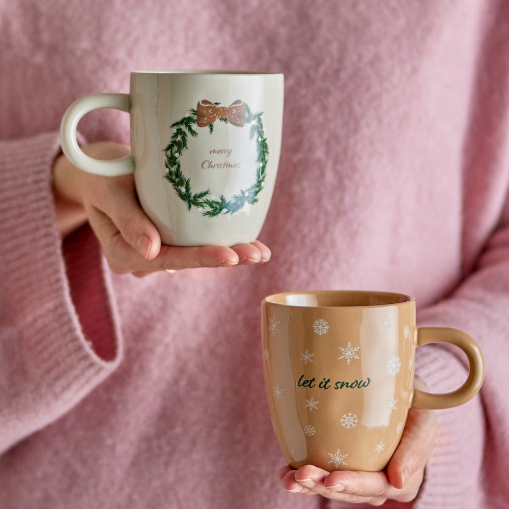El juego incluye dos tazas de café de gres, decoradas con adorables motivos: una tiene las palabras «Let it snow» rodeadas de copos de nieve y la otra, una guirnalda clásica con las palabras «Merry Christmas».