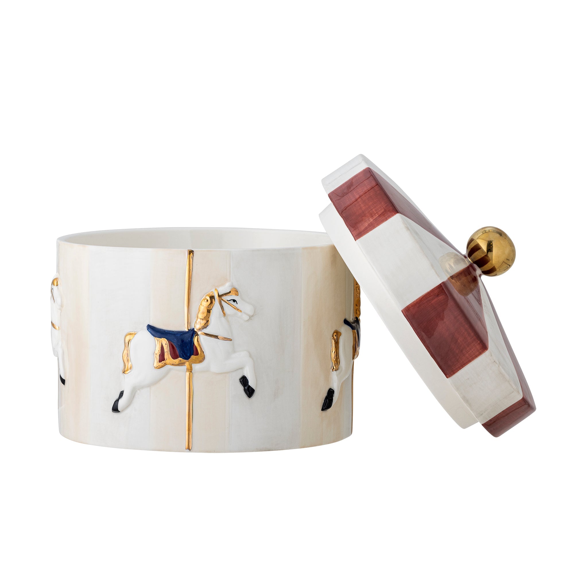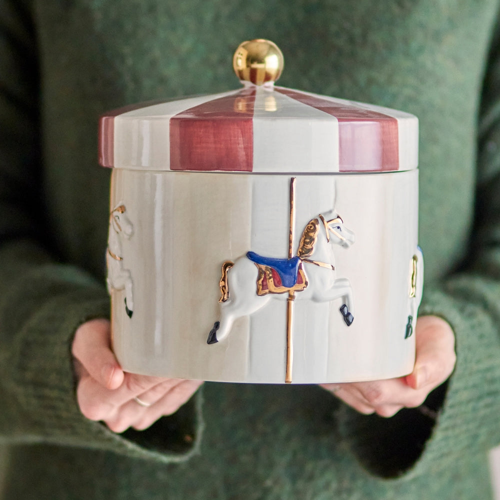El diseño de carrusel pintado a mano, combinado con detalles dorados, hace que cada recipiente sea único y encantador.
