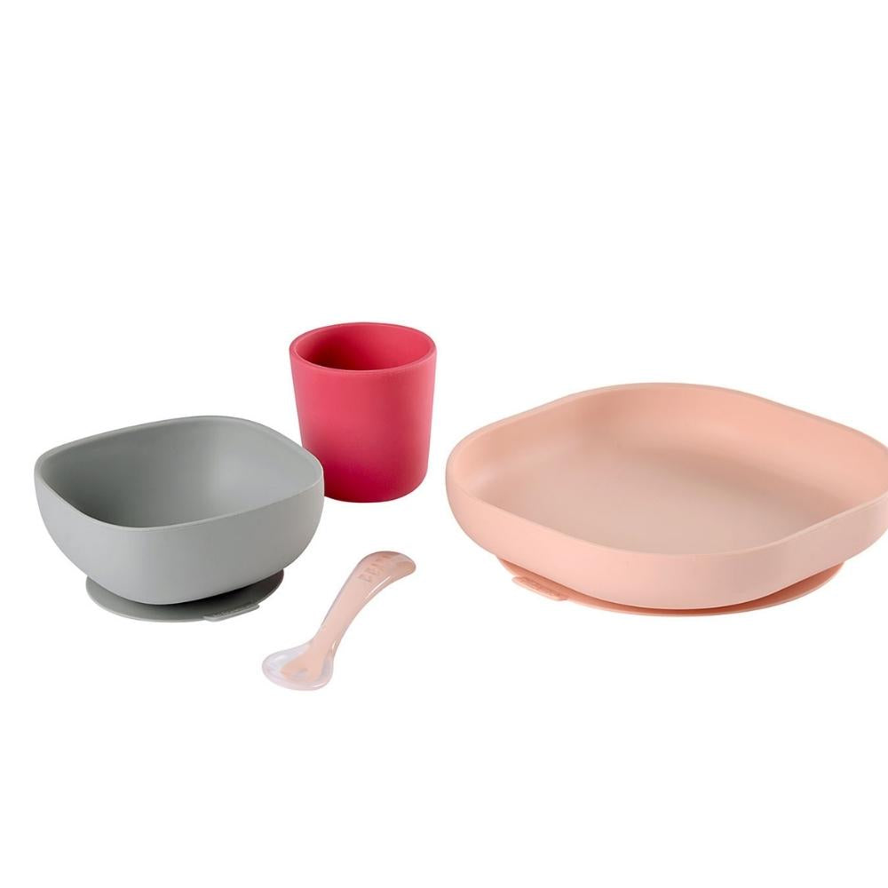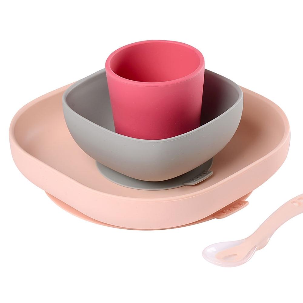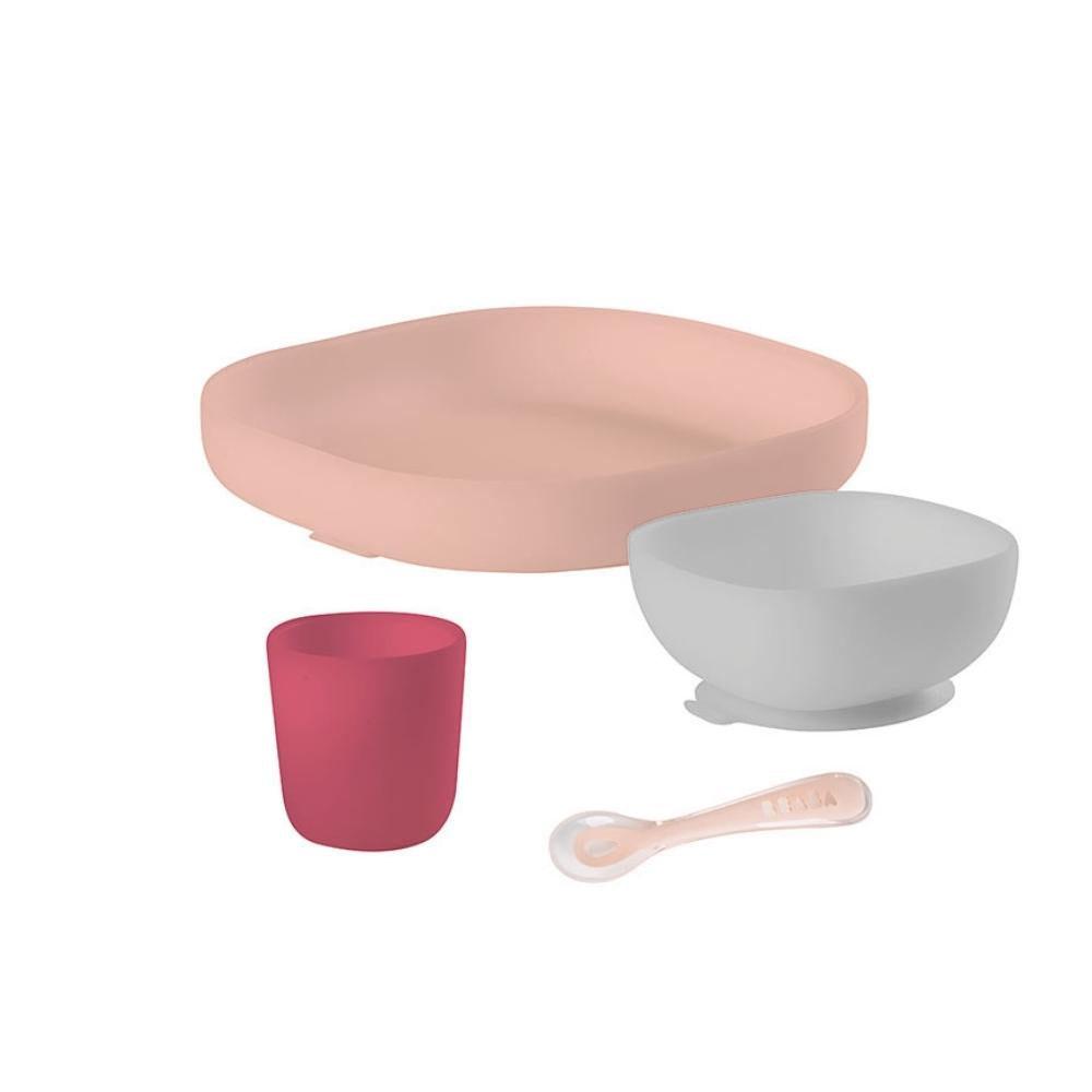 El juego de utensilios de silicona de la reconocida marca rosa Beaba consta de un plato, un bol, una taza y una cuchara de aprendizaje.