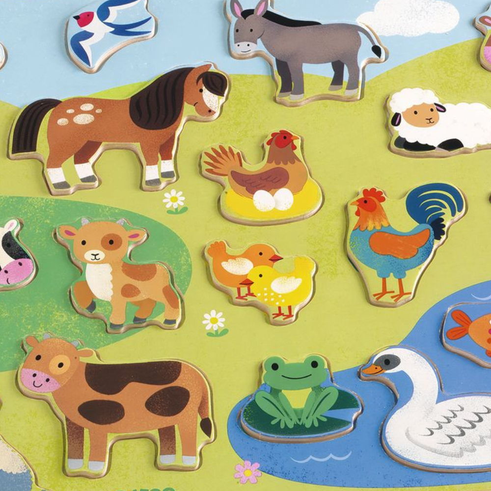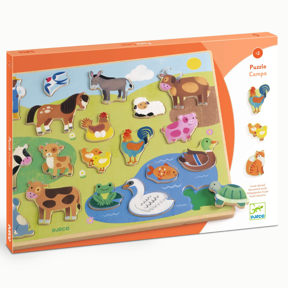 Un rompecabezas de madera con temática agrícola de Djeco.