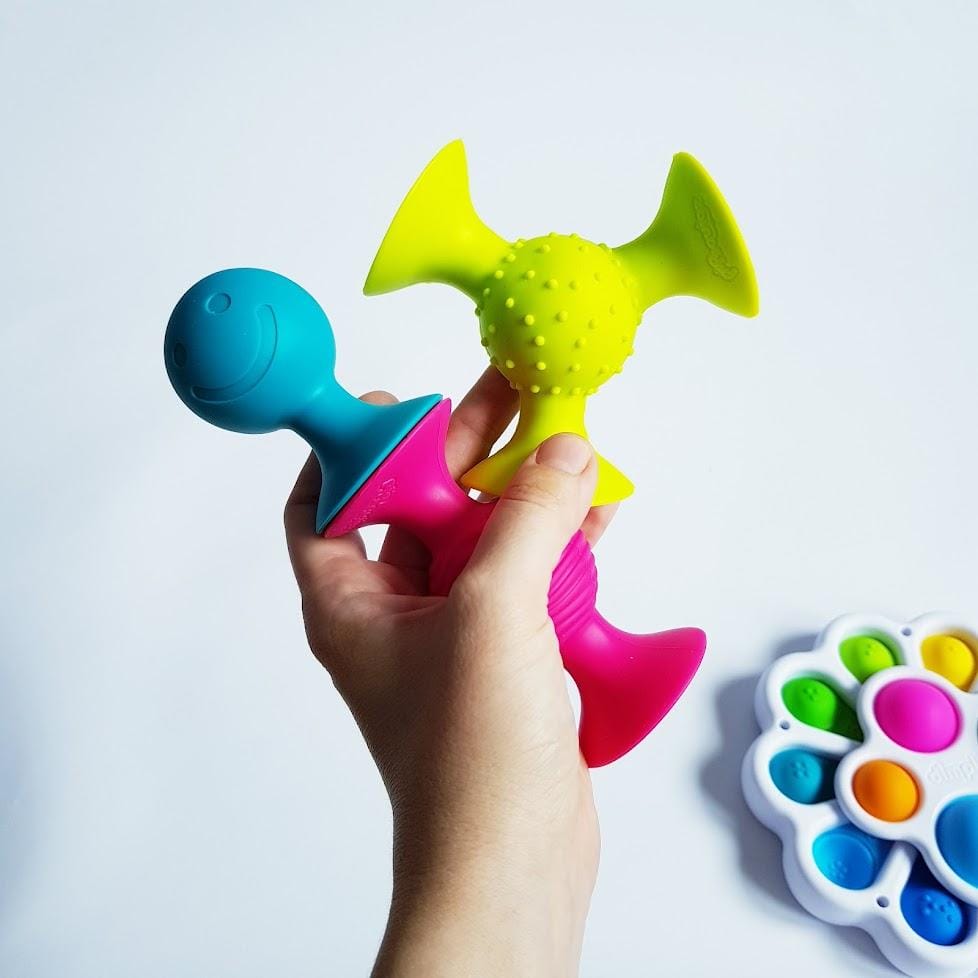 Las ventosas de Fat Brain Toys son bonitas, coloridas, tienen diferentes texturas, suenan y se adhieren literalmente a cualquier superficie: en la bañera, en el cochecito, en el suelo de la cocina.