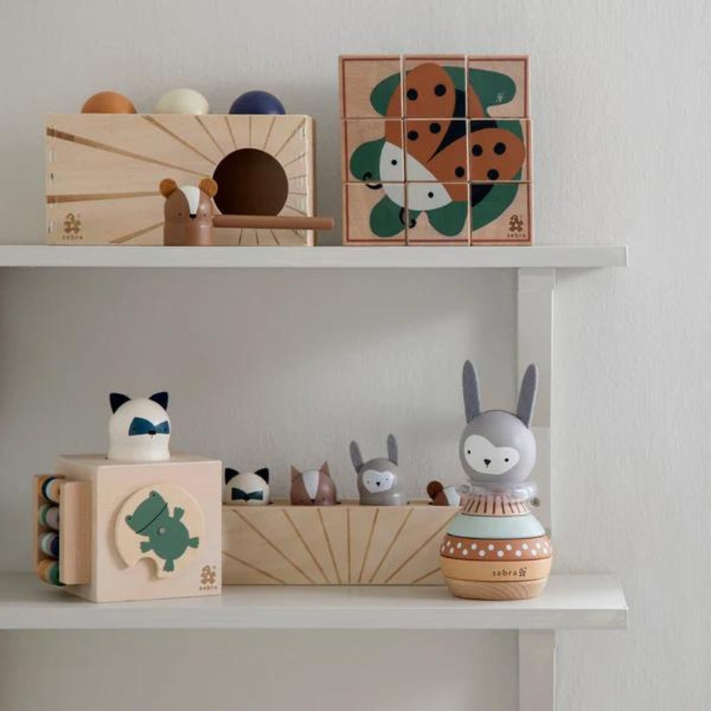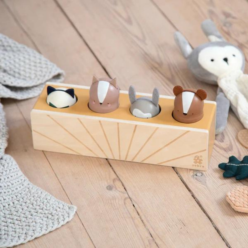 El juguete pop-up Woodland de Sebra es un divertido juguete de madera que contiene cuatro adorables animales.