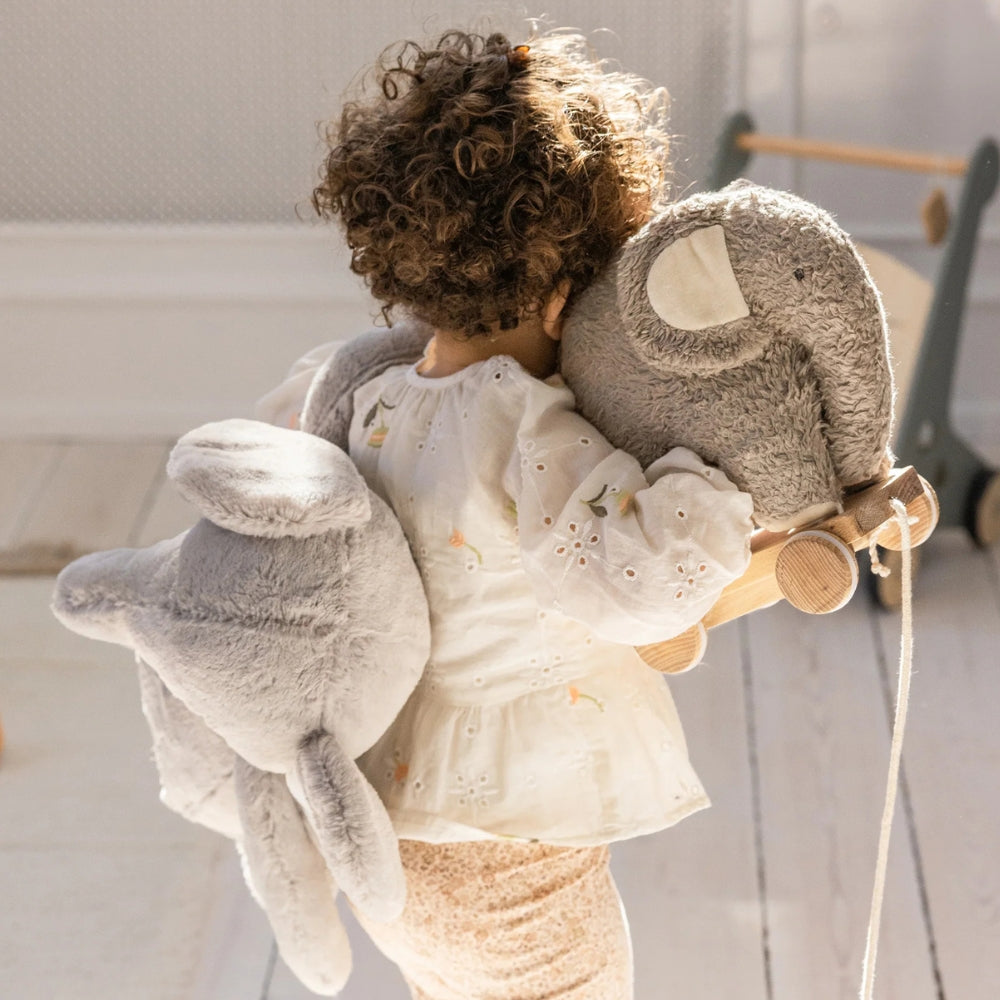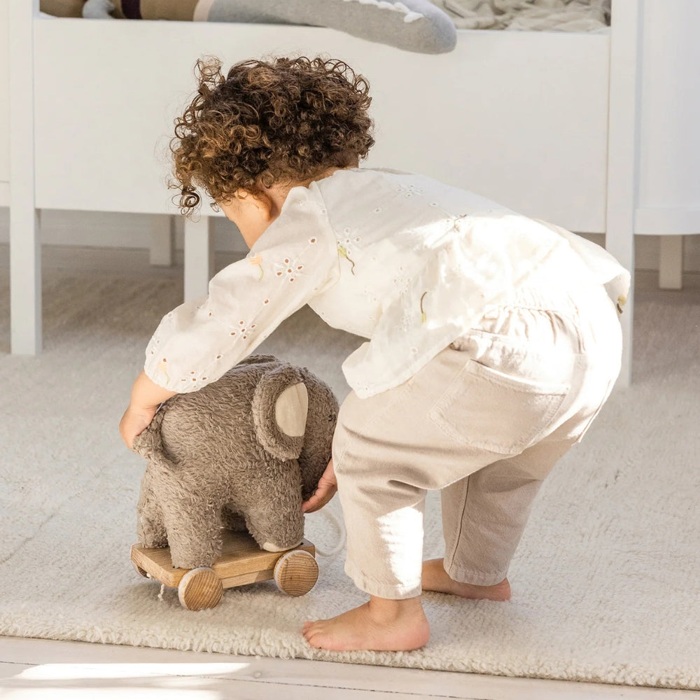 El elefante tiene un cordón de algodón para que el niño pueda llevarlo consigo cuando salga a pasear. Fanto también se puede separar de la base y lavar en la lavadora a 30 °C, lo que facilita mantener el juguete limpio.