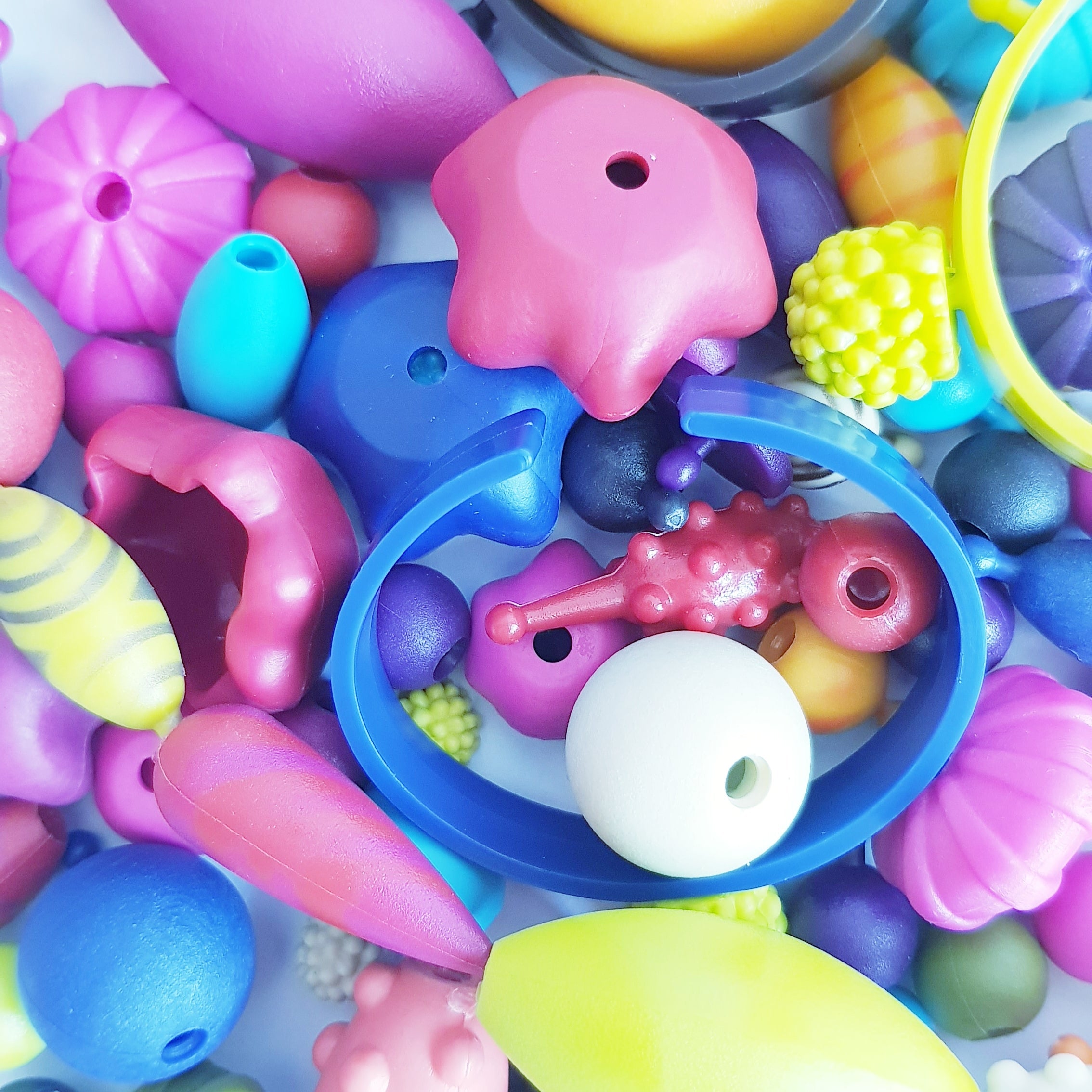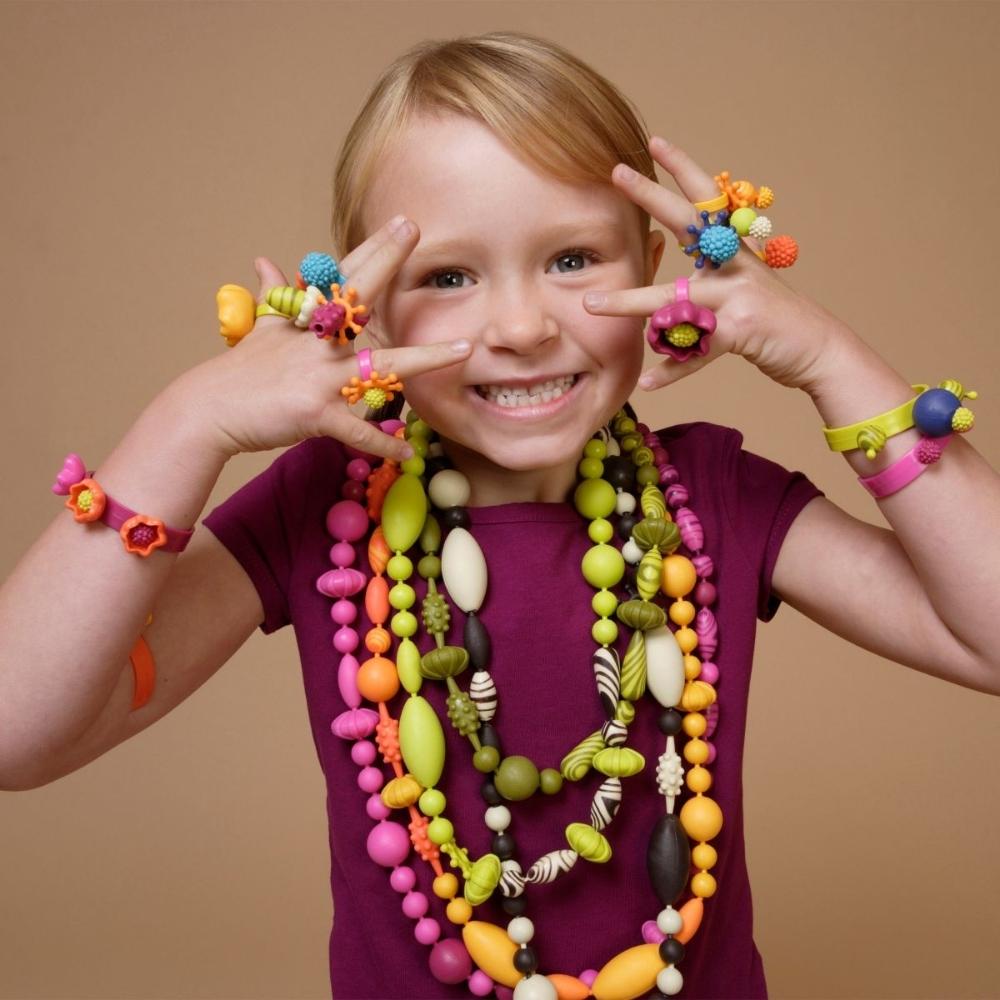 El kit creativo para crear joyas - cuentas de B.Toys incluye 300 elementos sensoriales diferentes en un tarro.