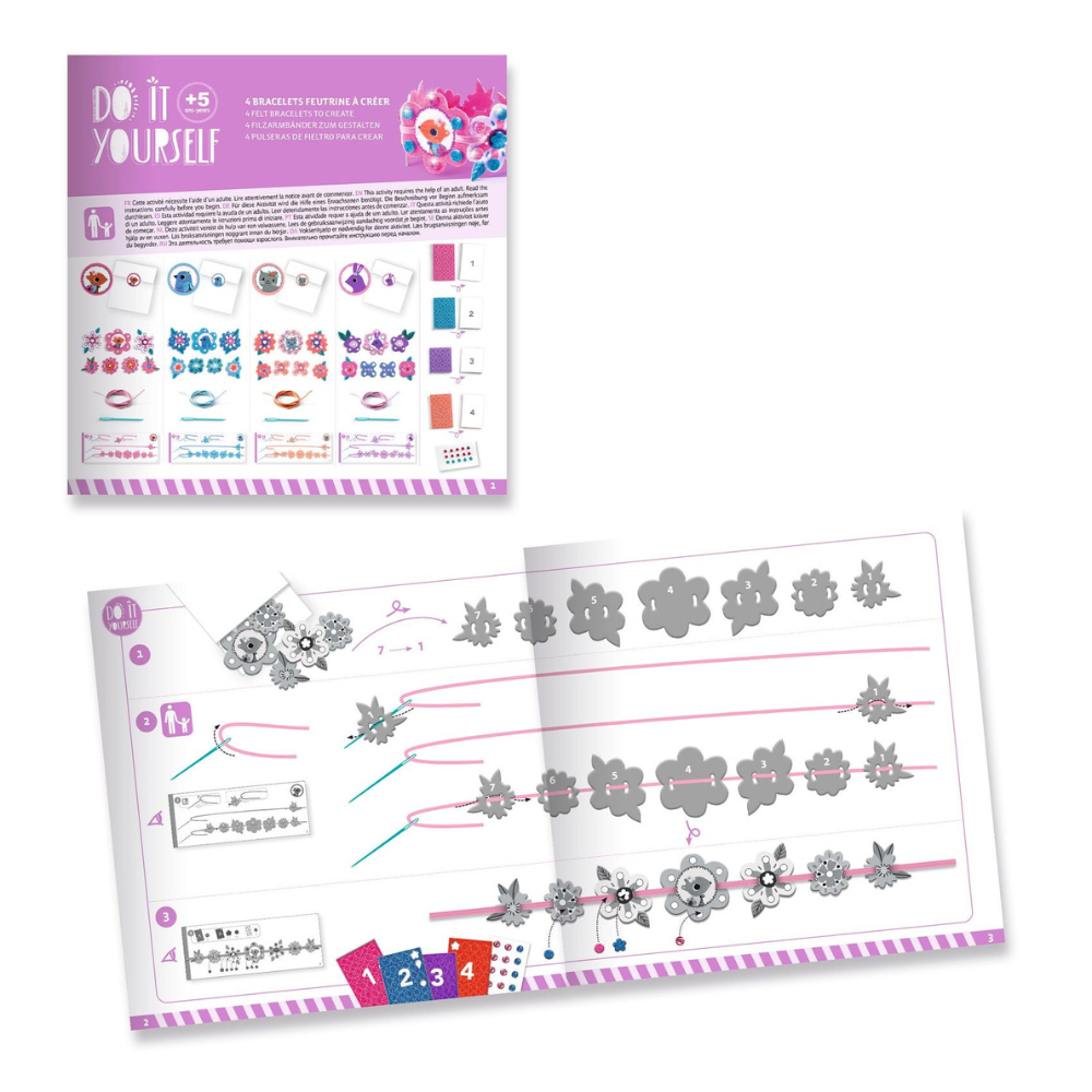 En la caja encontrarás todo lo necesario para crear 4 preciosas pulseras de la amistad: fieltro suave al tacto, pegatinas brillantes de espuma y pegatinas con forma de «guijarros» de colores.