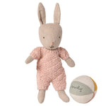 El set incluye una pelotita y un conejito de tamaño micro, equipado con imanes en las patas para que pueda sujetar un biberón.
