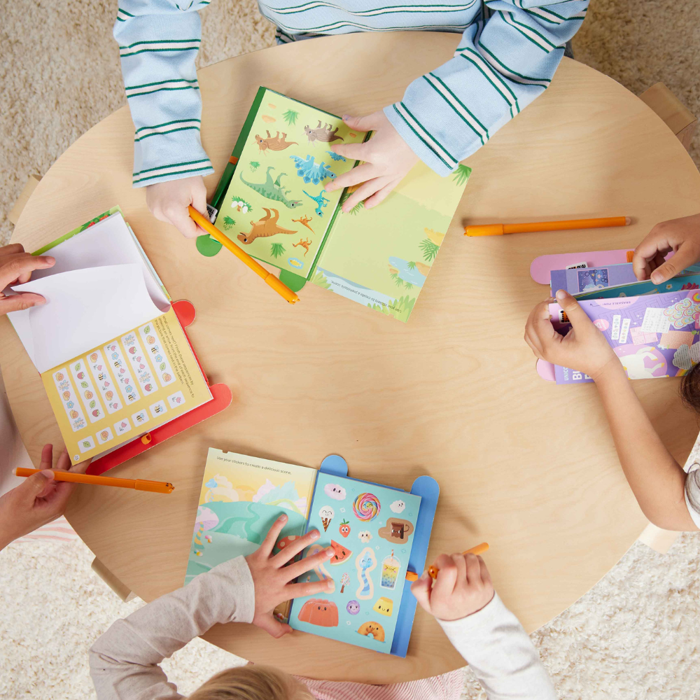El conjunto incluye 25 páginas de actividades variadas, una hoja de pegatinas y un rotulador borrable: el conjunto perfecto para un juego creativo sin fin.