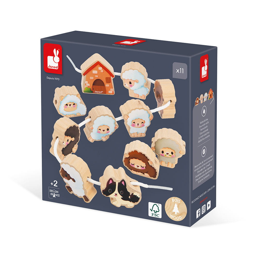 El juego incluye dos cuerdas blancas con extremos laminados en las que se pueden ensartar las piezas de madera: 9 ovejas, 1 edificio de granja y 1 perro pastor, creando diferentes historias de la vida en la granja.