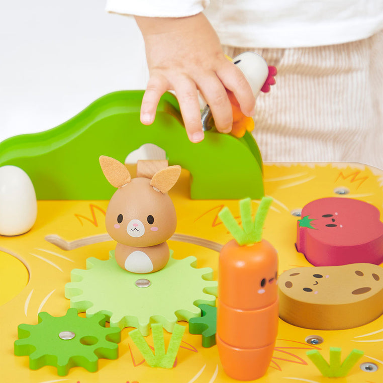 Entre otras cosas, hay 8 actividades diferentes, un bucle con cuentas para mover, una gallina con resorte, una gallina para deslizar por una pista, un huevo para girar, molinillos, una pirámide-zanahoria para apilar o formas para colocar en las cavidades (clasificador).