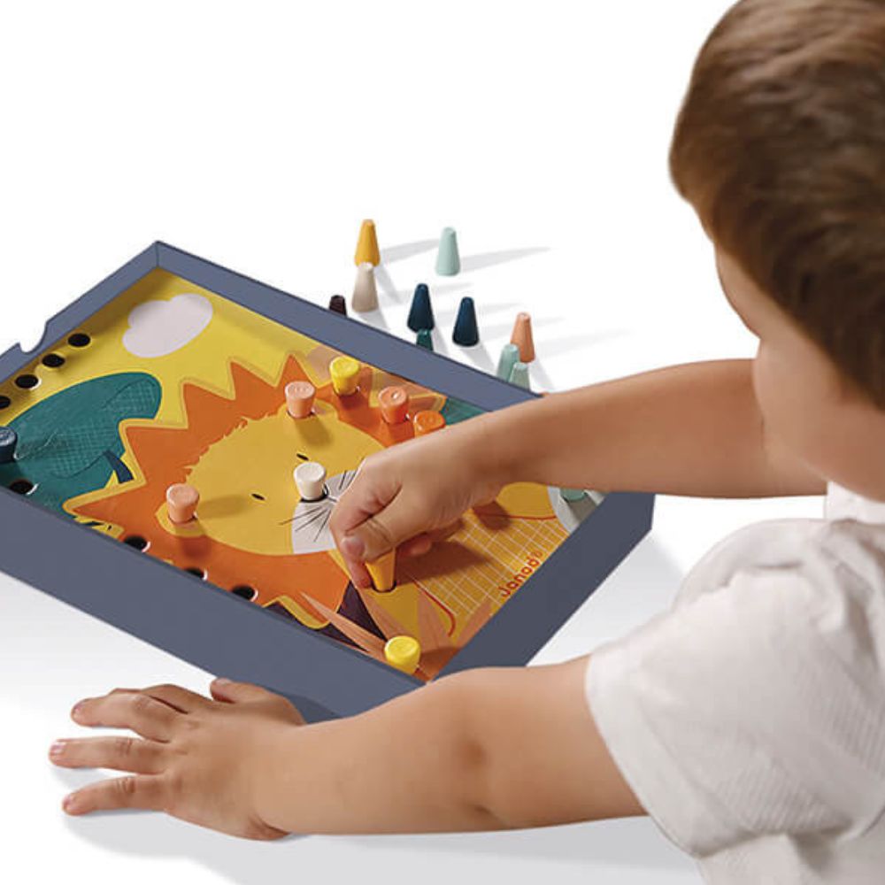 El rompecabezas de madera de Janod presenta mosaicos infantiles hechos de cartón grueso con agujeros recortados donde hay que colocar clavijas de madera del color que coincida con el fondo en un lugar determinado de la ilustración.