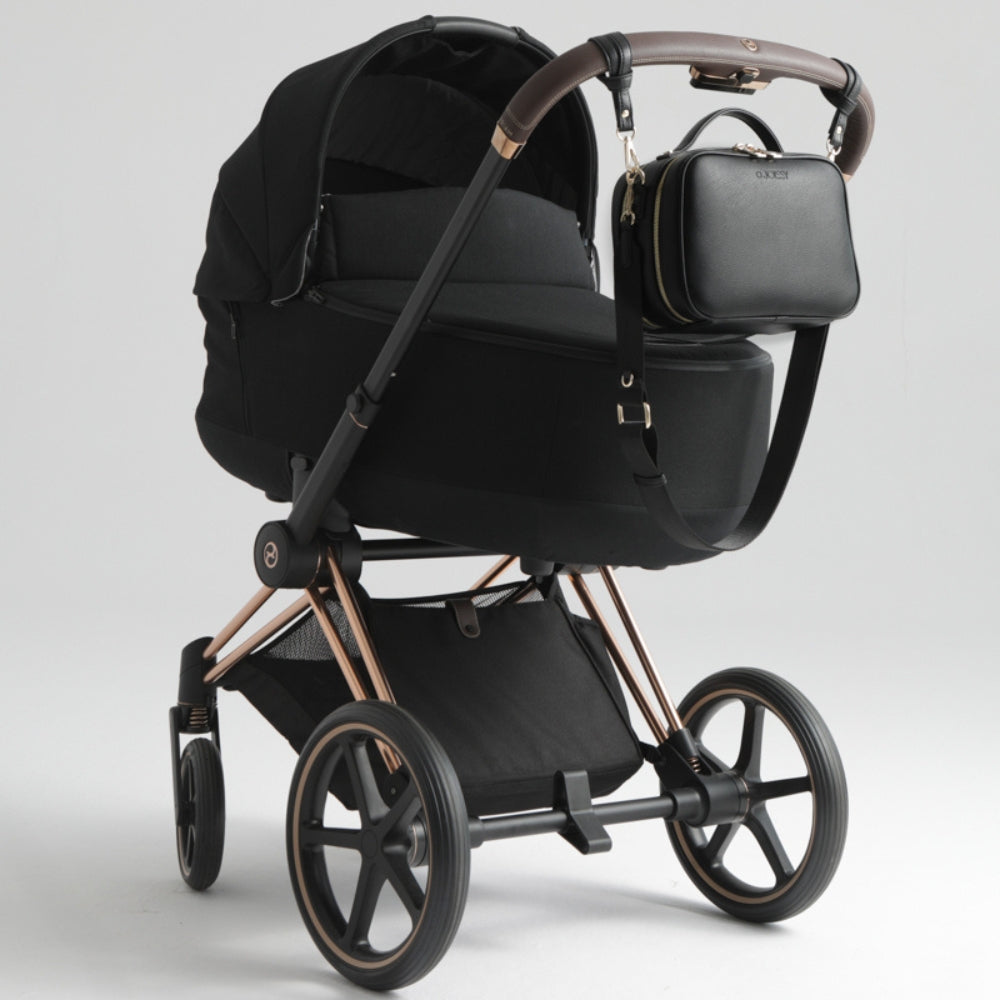 La bolsa VERA incluye ganchos especiales para colgarla del cochecito cuando sales con tu bebé.