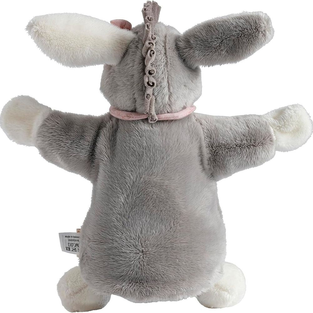 Fabricada con un material suave y agradable al tacto, la marioneta cuenta con detalles cuidadosamente cosidos, como el lazo en la oreja y el collar rosa.