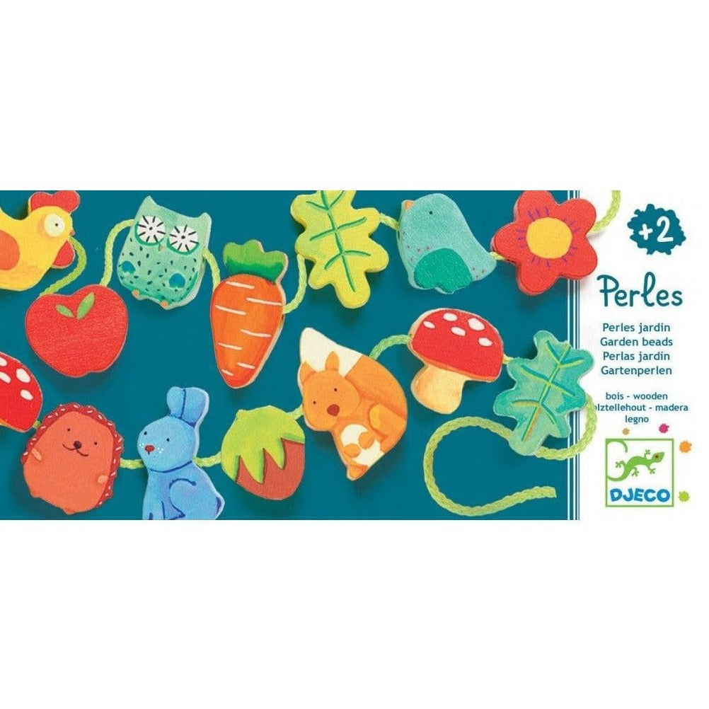 El juego de ensartar para niños tiene 16 cuentas de colores, incluyendo animales, flores y verduras.