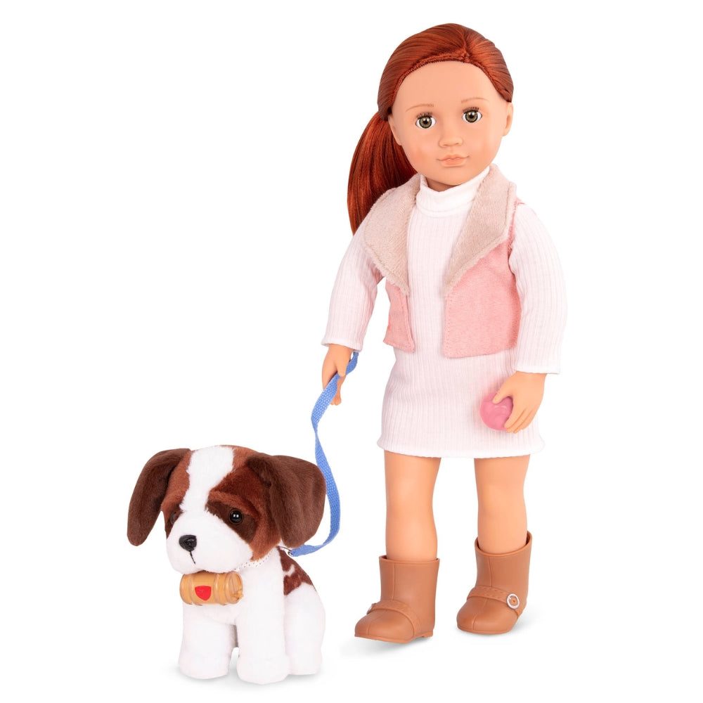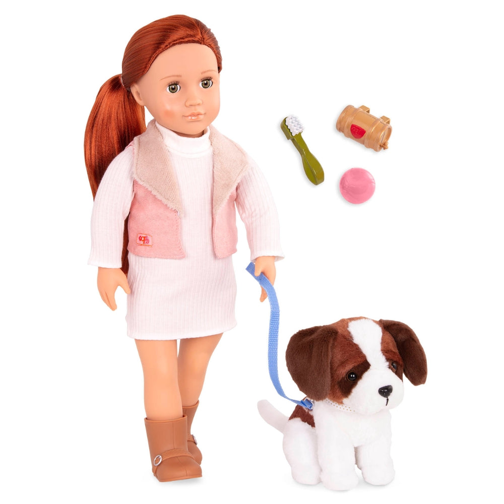 Bonita muñeca Delphia con cachorro San Bernardo y accesorios de Our Generation.