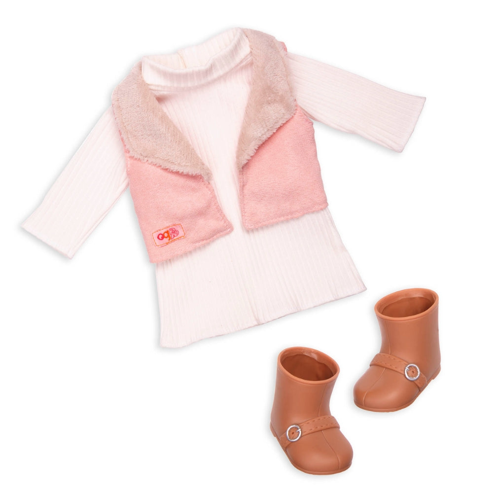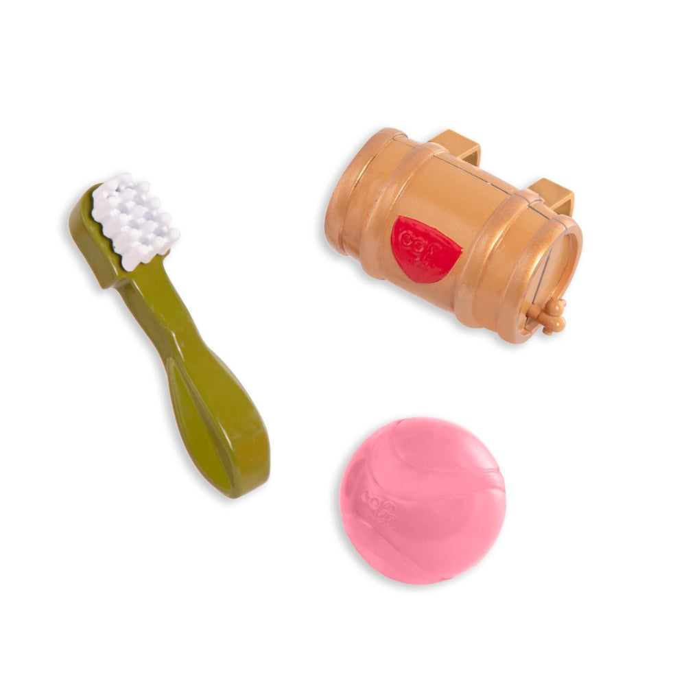 - El set incluye: muñeca de 46 cm, vestido de punto con cuello alto, chaleco, ropa interior, botas, perrito, pelota, cepillo de dientes para perros, barril decorativo, correa acoplable, collar y correa.