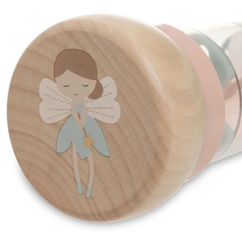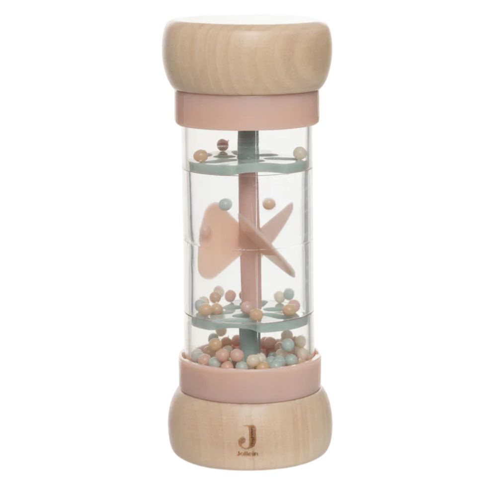Dentro del cilindro transparente hay bolitas de colores que rebotan alegremente cuando se mueve el juguete, creando un sonido suave y agradable que recuerda a la lluvia cayendo.
