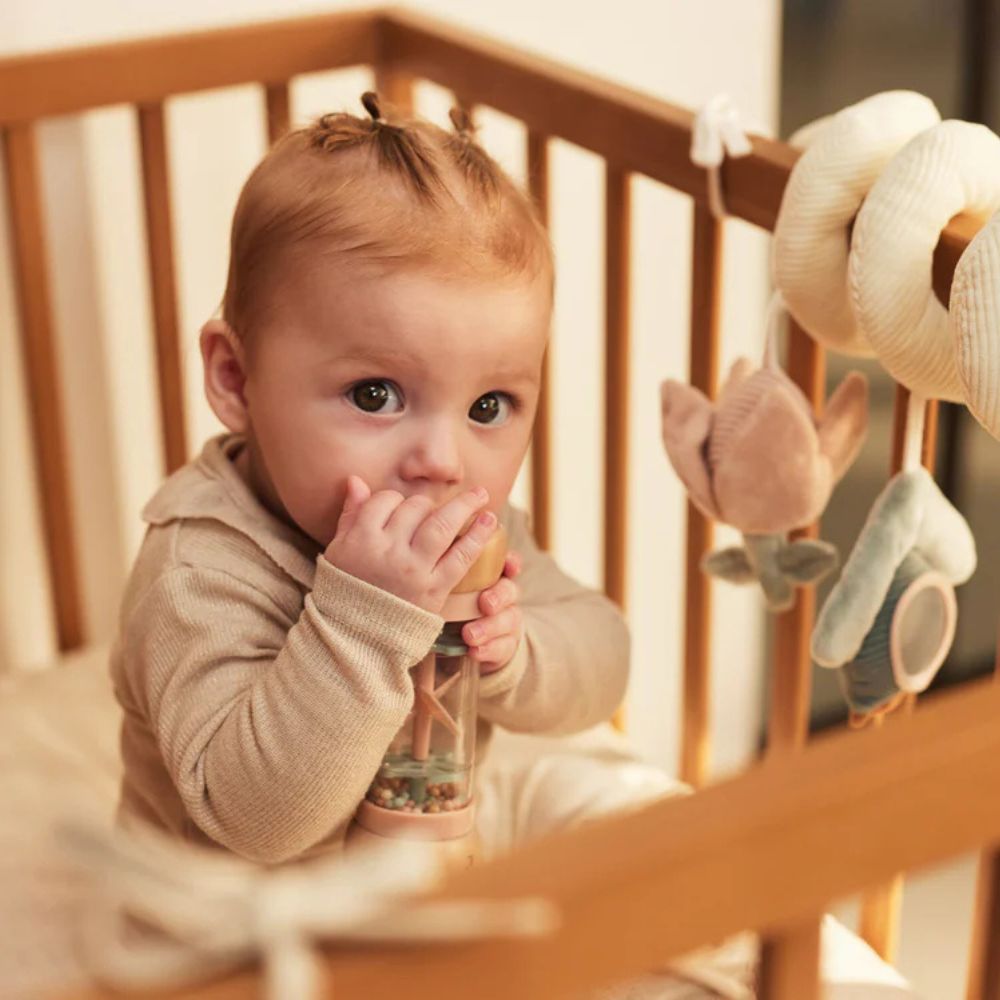 También es ideal como sonajero para regalar en un nacimiento o en un baby shower, ya que no solo es funcional, sino también estéticamente agradable.