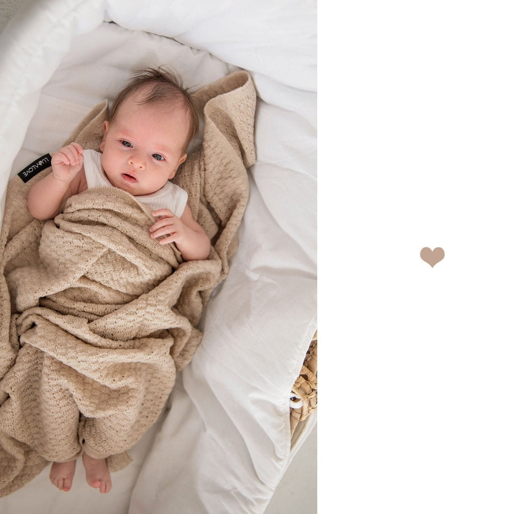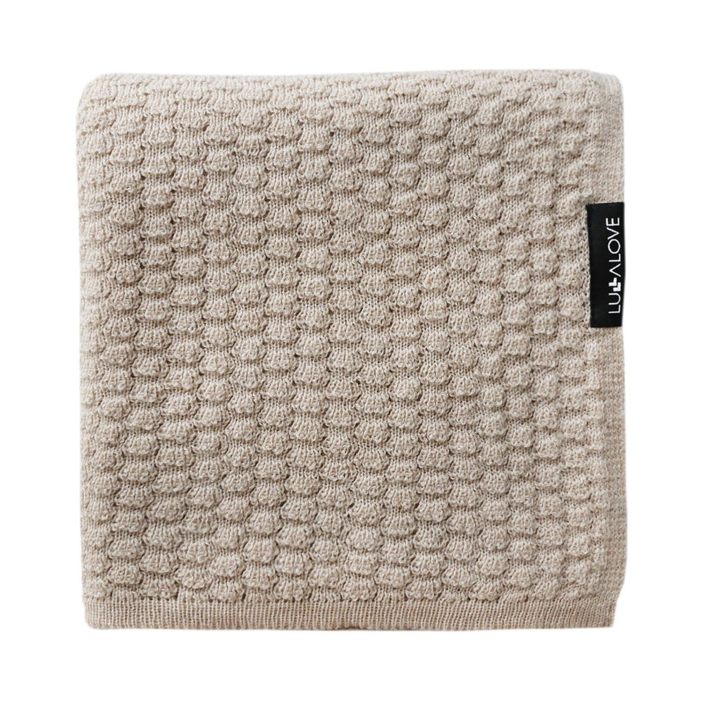 La suave manta beige con diseño de mariposas de lana merino también se puede utilizar como mantita para bebés de LullaLove.