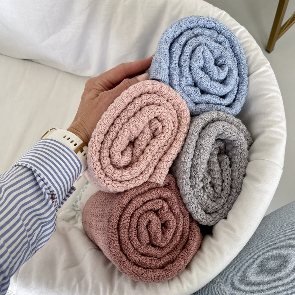 La manta de lana merino tiene un bonito tejido en forma de pequeñas alas de mariposa.
