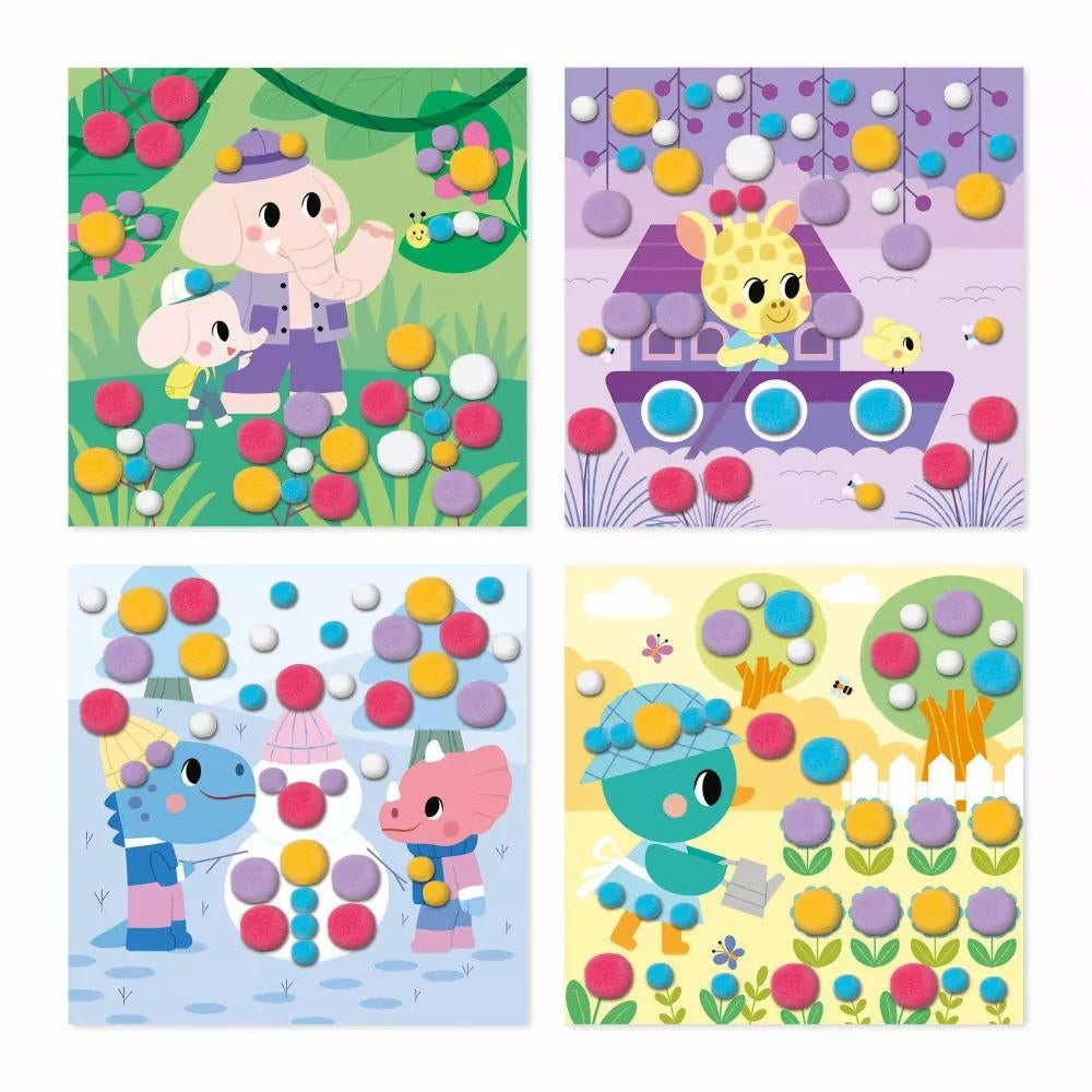 El set creativo Janod para niños incluye 4 láminas con adorables animales en situaciones inusuales: jirafas navegando en un barco, un patito regando un parterre, dinosaurios construyendo un muñeco de nieve y elefantes de excursión por el bosque.