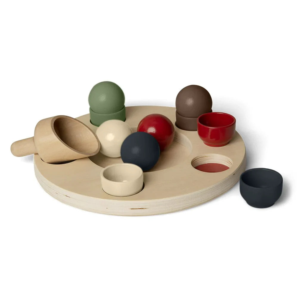 El juguete de destreza tiene cinco cuencos, cada uno de un color diferente, así como bolas del mismo color y una cuchara para transportarlas.