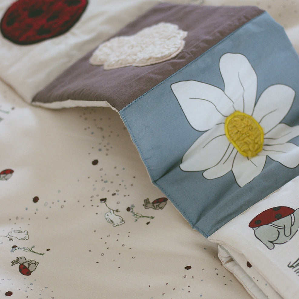 Cuenta con un espejo que encanta a los niños pequeños, elementos salientes y acabados de tela con forma de nube y mariquita.