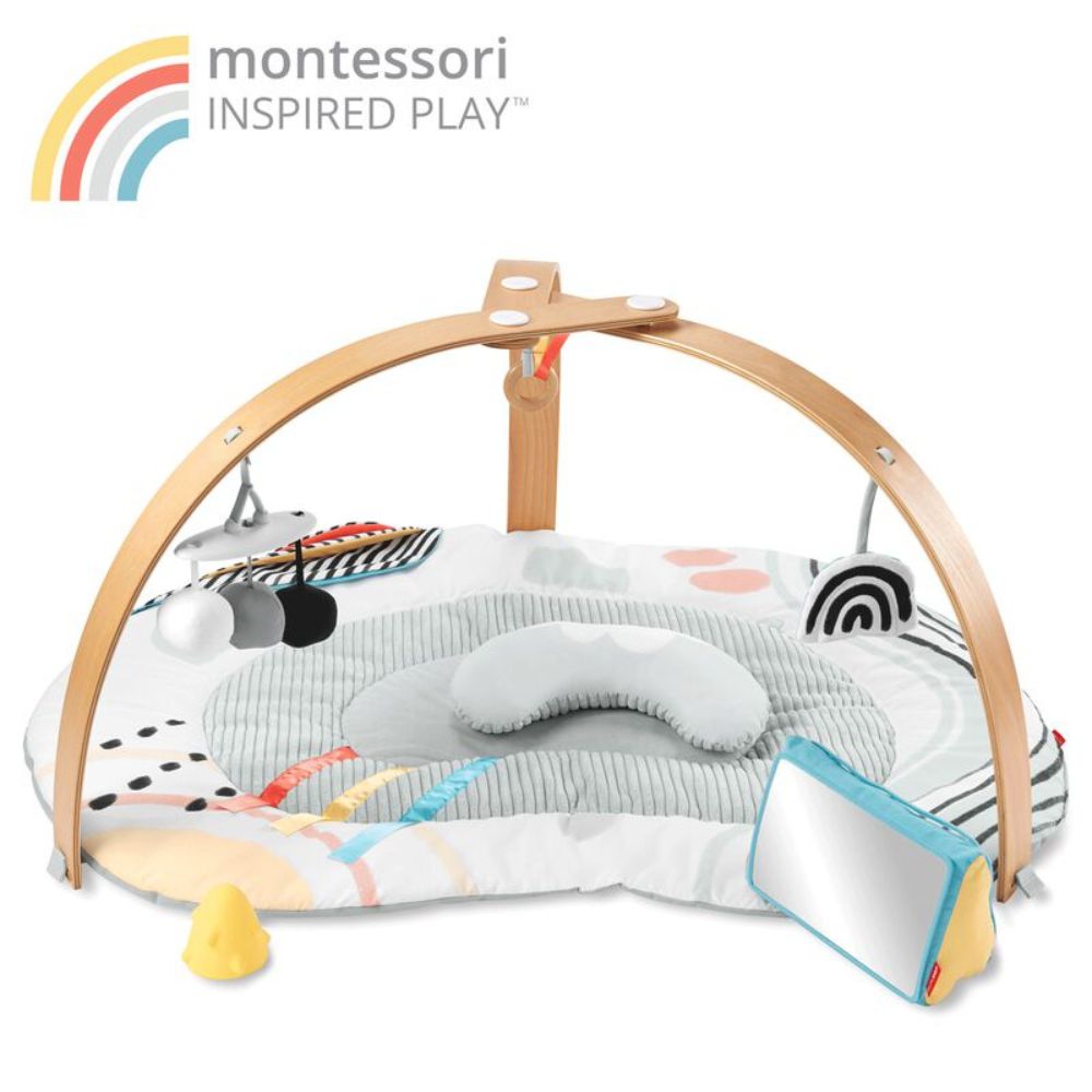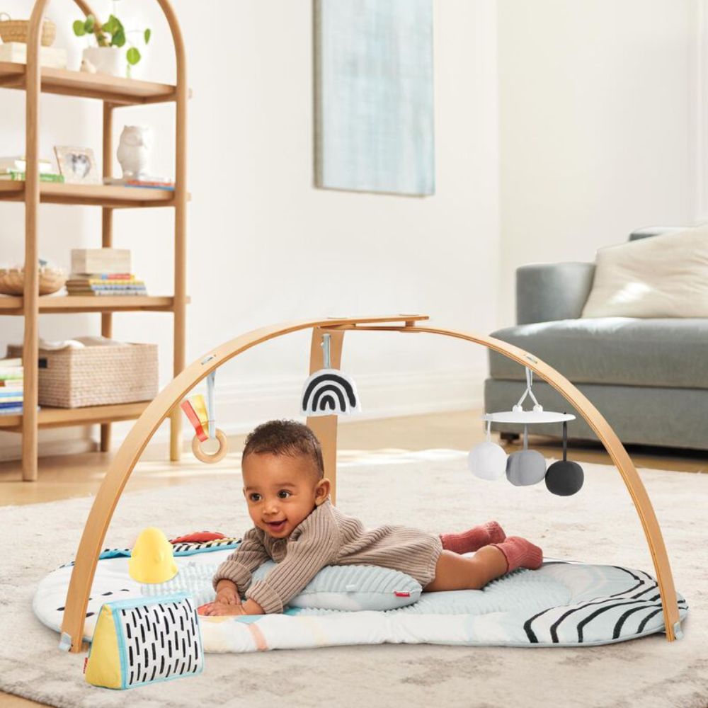 La alfombra educativa de Skip Hop cuenta con cinco juguetes de desarrollo inspirados en la naturaleza que cuelgan de arcos de madera fabricados con materiales sostenibles.