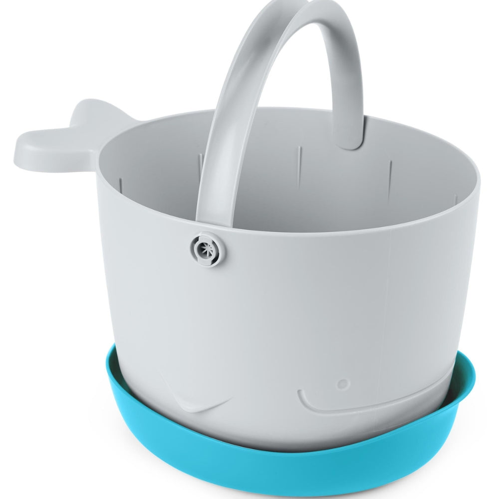 El cubo de juguetes Skip Hop con motivo de ballena en color gris es una solución práctica y adorable para ayudar a mantener el orden durante el baño.