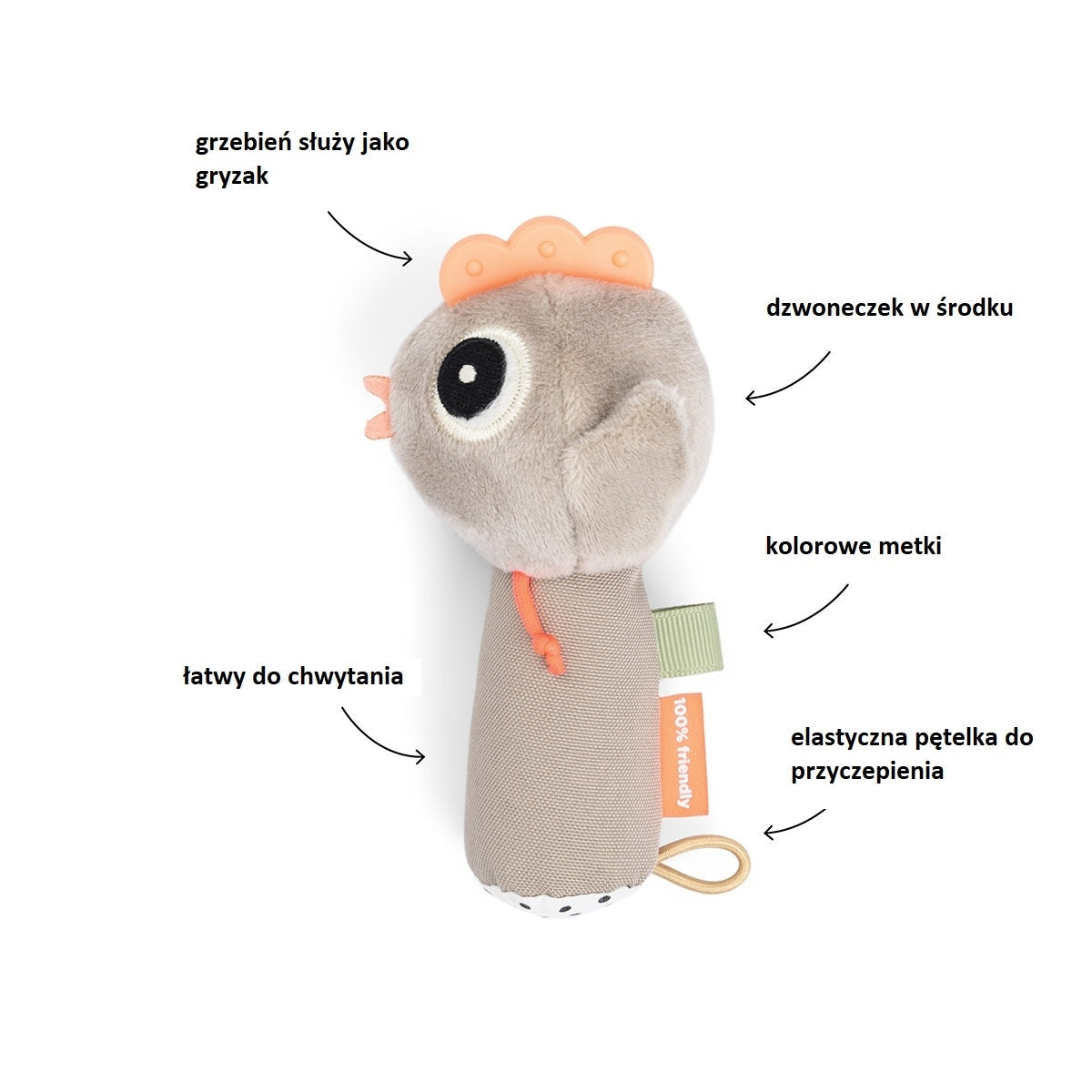 El sonajero ha sido diseñado para desarrollar el oído, el tacto y la vista, al tiempo que proporciona alivio durante la dentición: la cresta del gallo actúa como un práctico mordedor para calmar las encías irritadas.