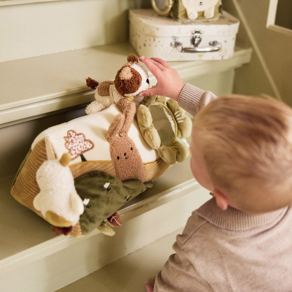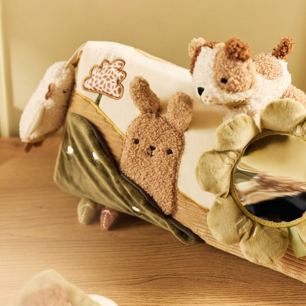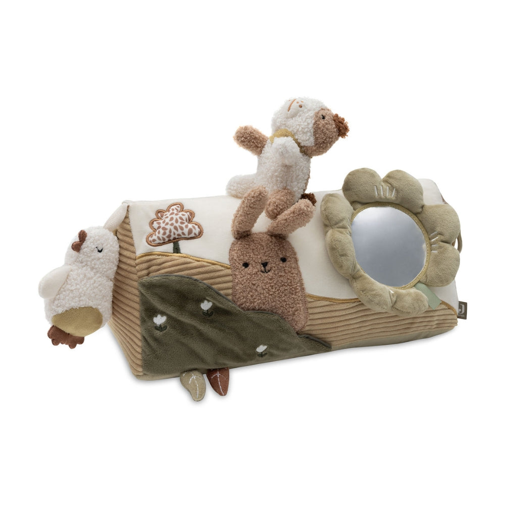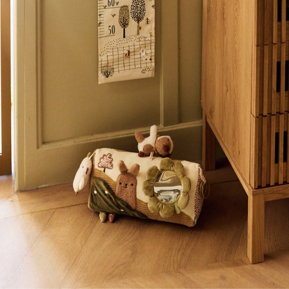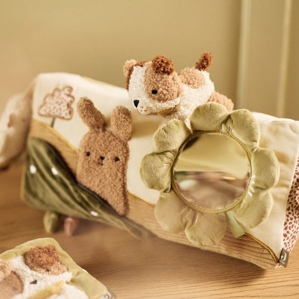 El juguete está equipado con diversos elementos activadores, como un espejo ideal para jugar boca abajo que anima al bebé a levantar la cabeza y mirar su reflejo.