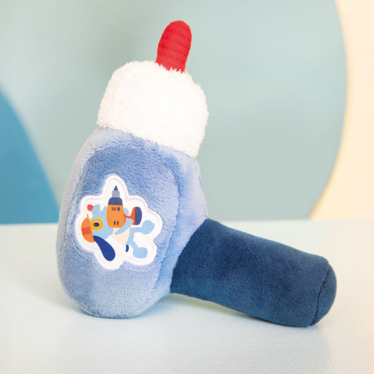 Un sonajero con forma de taladro de juguete de la colección Jules Dog de Lilliputiens es una opción encantadora para los más pequeños.