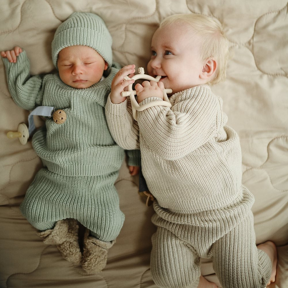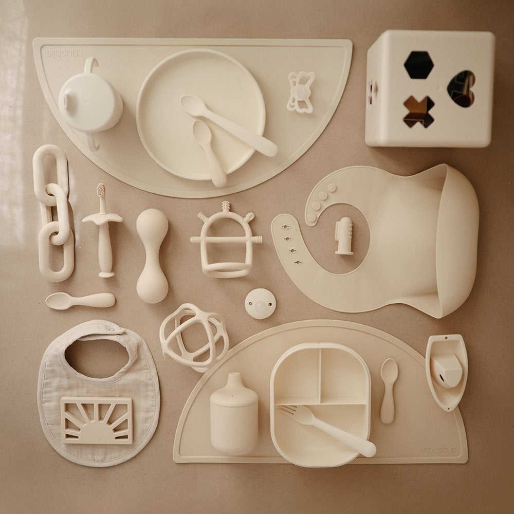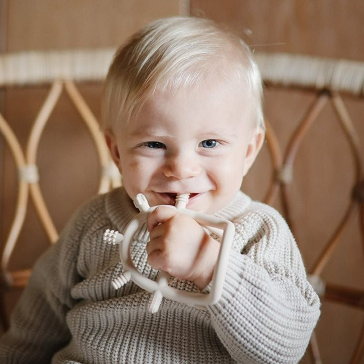 El mordedor para bebés de Mushie está fabricado con silicona hipoalergénica de alta calidad apta para uso alimentario, totalmente segura para el bebé.
