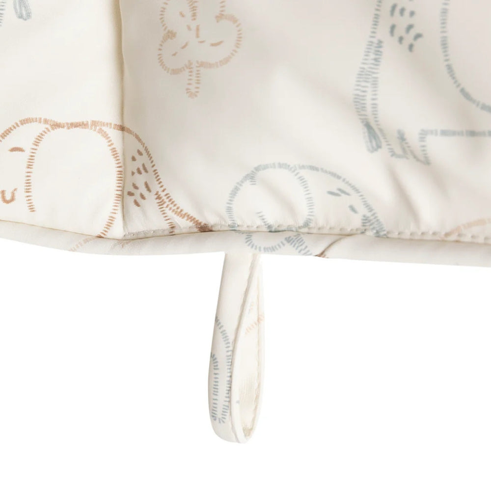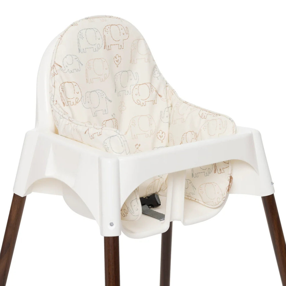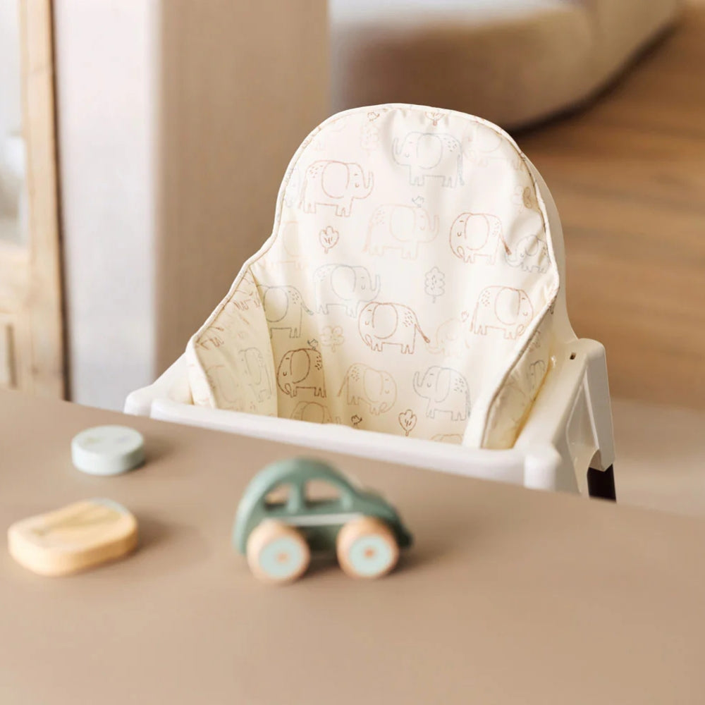 El cojín para silla de comer de Jollein con el simpático estampado Elephant Tales hace que sentarse durante la comida sea aún más cómodo.