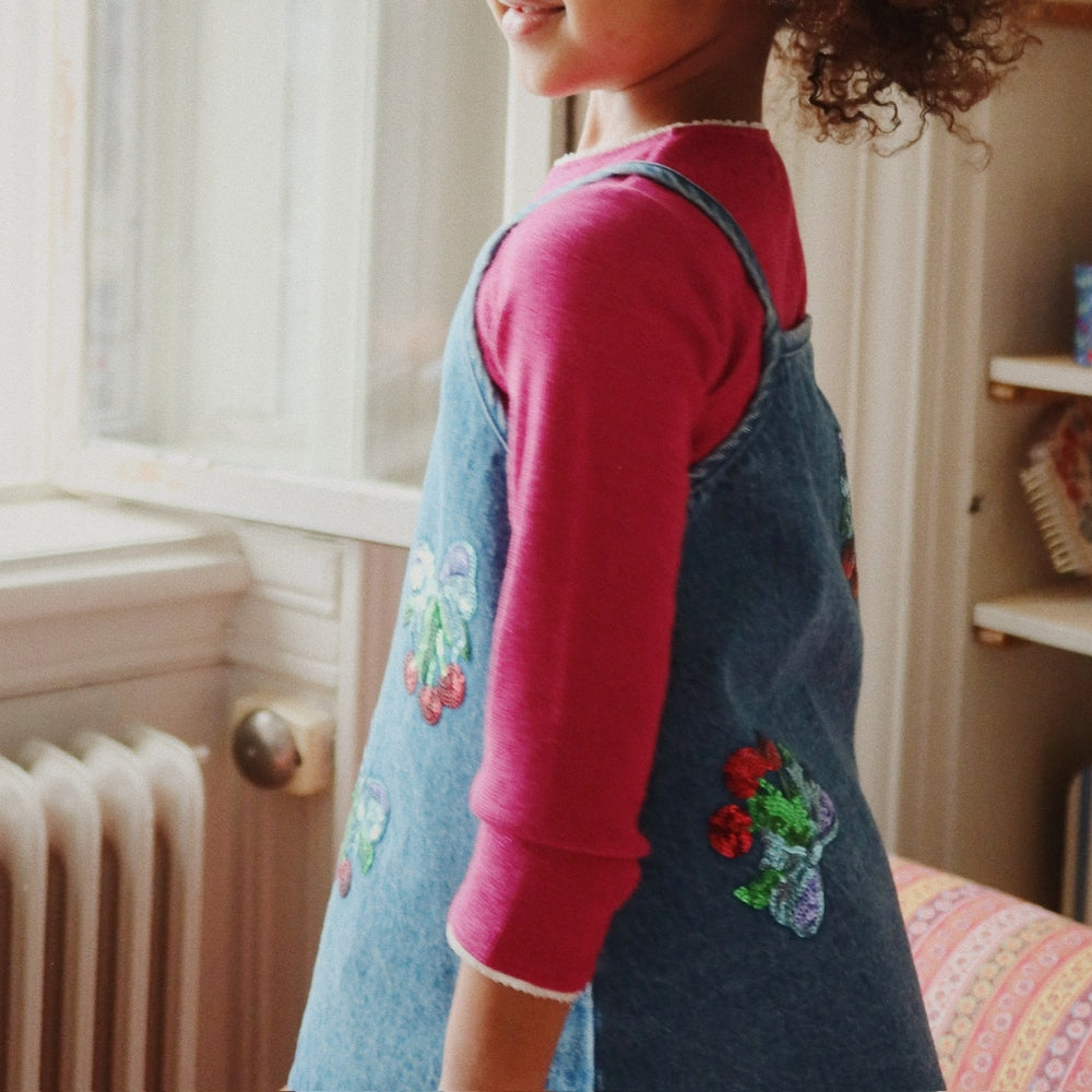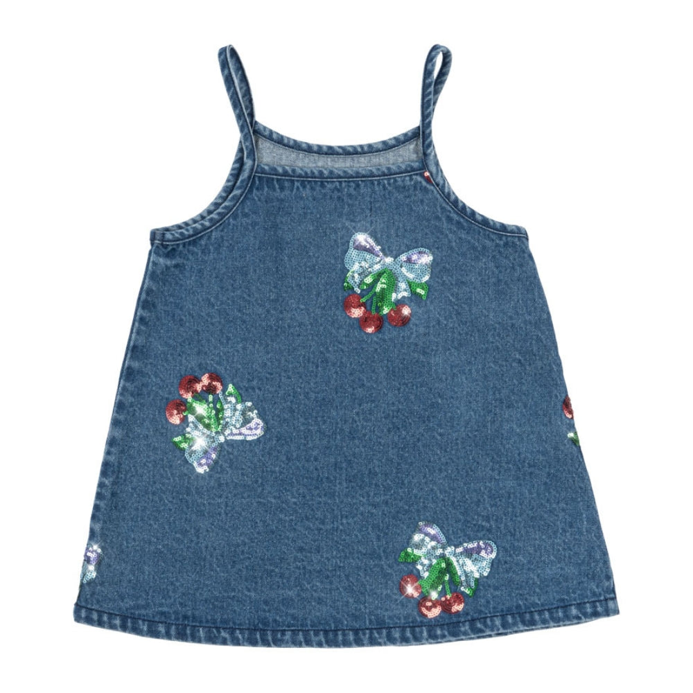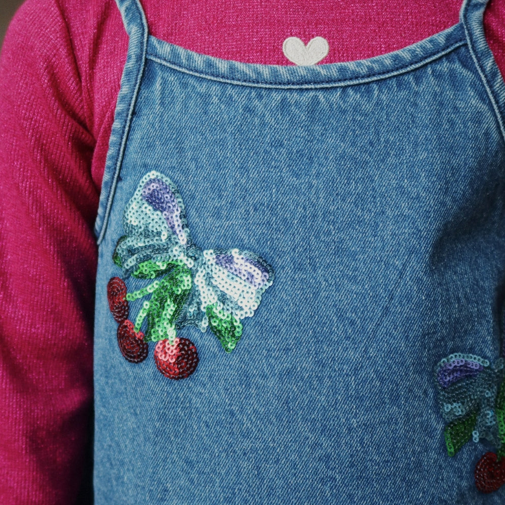 Confeccionado en denim de alta calidad, presenta sutiles bordados con lazos de cerezas con lentejuelas que le dan un toque especial.