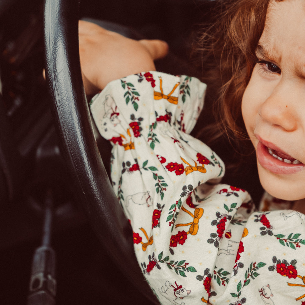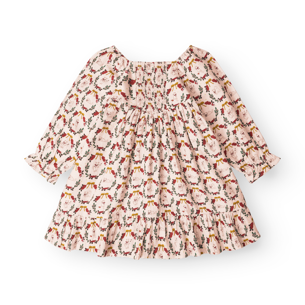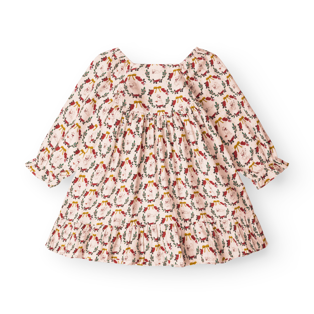 Su delicado estampado de guirnaldas y motivos festivos te contagia al instante de alegría. El vestido está confeccionado con algodón orgánico suave, lo que lo hace ideal para la piel sensible del bebé y cómodo incluso durante un largo día lleno de diversión y reuniones familiares.