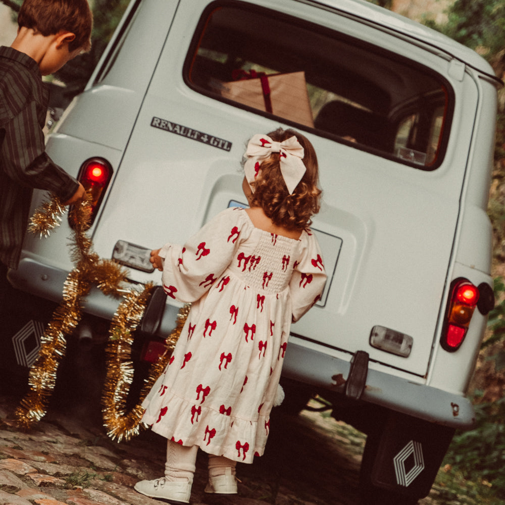 Confeccionado en suave algodón orgánico de textura fina, destaca por su sutil tono crudo y su encantador estampado de lazos rojos.
