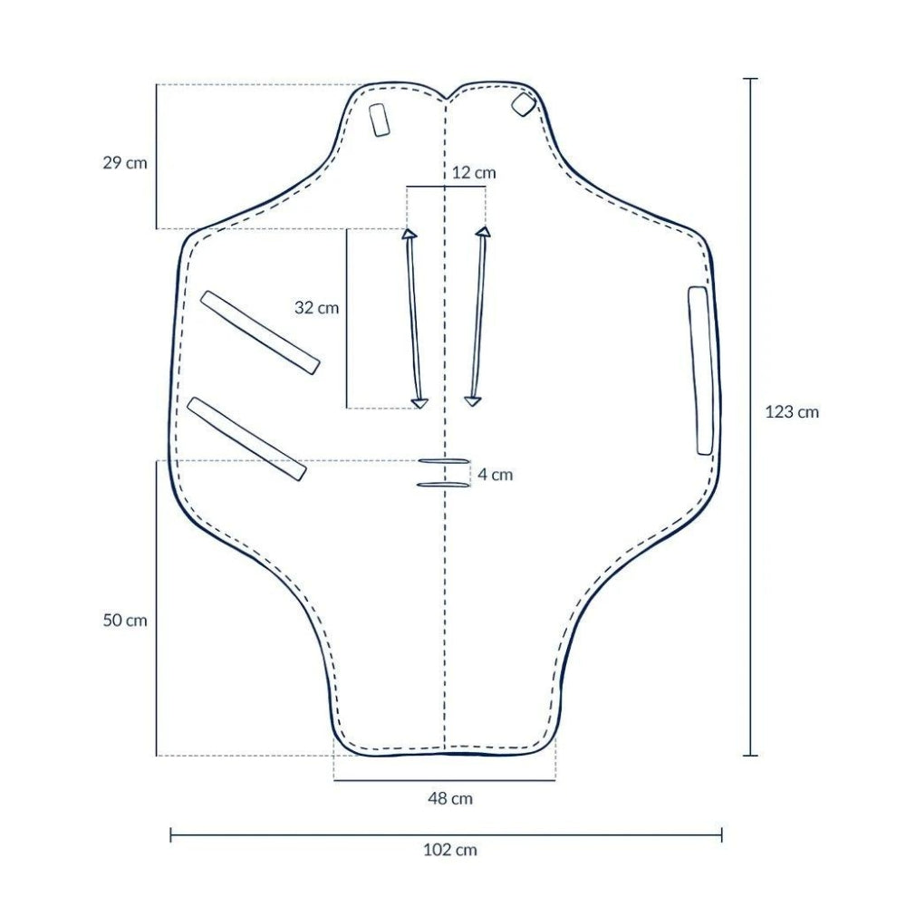 La manta tiene 4 orificios para los cinturones de seguridad, velcro sin presión para evitar que la manta se mueva y dos correas de velcro.
