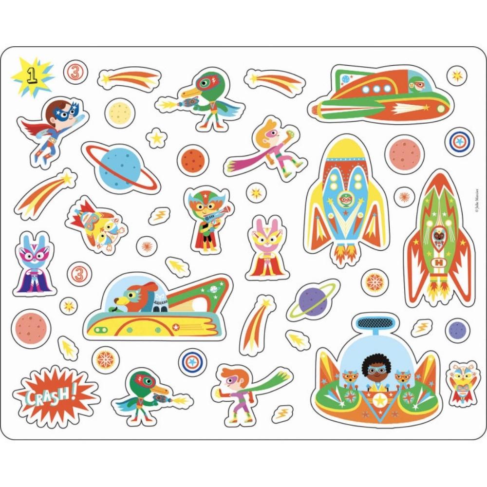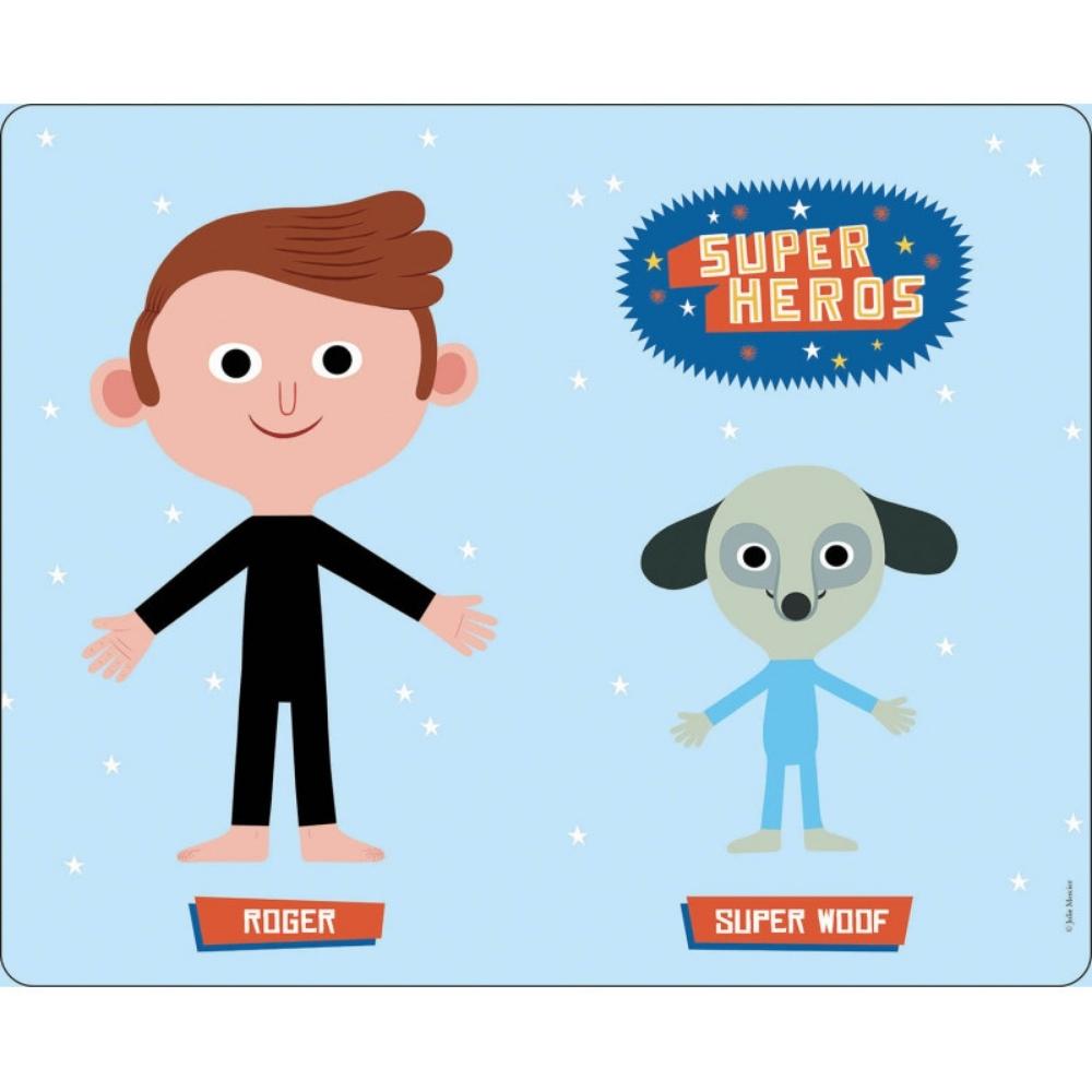 El set Super Heroes consta de hasta 200 pegatinas con tableros para jugar de forma creativa con tus personajes favoritos, Roger y Super Wolf.