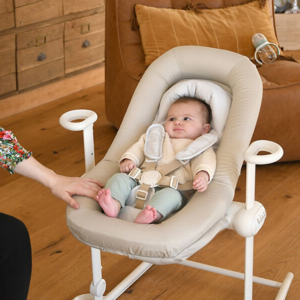 Esta mecedora permite que tu bebé participe activamente en la vida familiar desde los primeros días, estimulando su curiosidad por el mundo que le rodea.