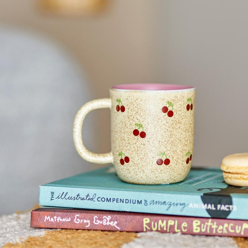 Fabricada en gres de alta calidad, destaca por su exterior beige decorado con pequeñas y divertidas cerezas y su interior rosa, que crea un contraste dulce y agradable.