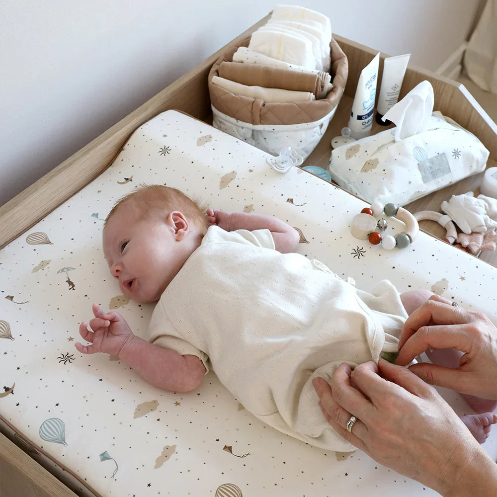 El delicado estampado en tonos blancos y marrones combina a la perfección con otros productos de la colección Dreamland: puedes combinarlo fácilmente con el cambiador, los organizadores o la bolsa para pañales de la misma marca.