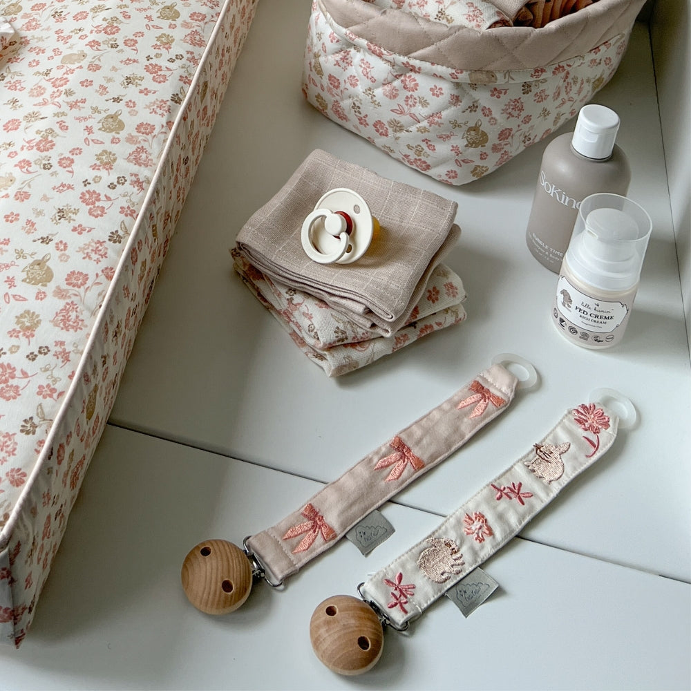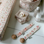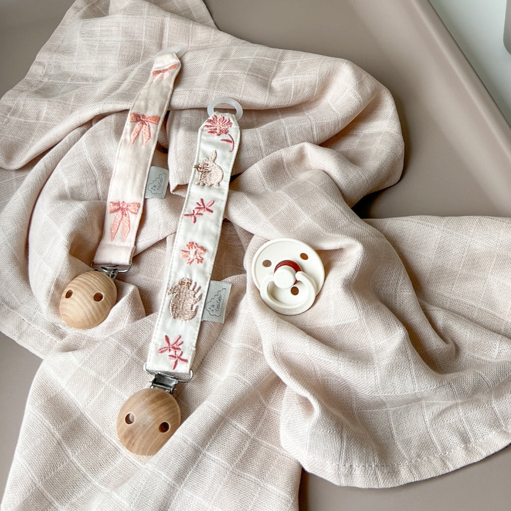 El elegante clip, fabricado en madera natural y metal sin níquel, permite fijar de forma segura el colgante para chupete a la ropa del bebé, protegiendo el chupete de caídas y suciedad.