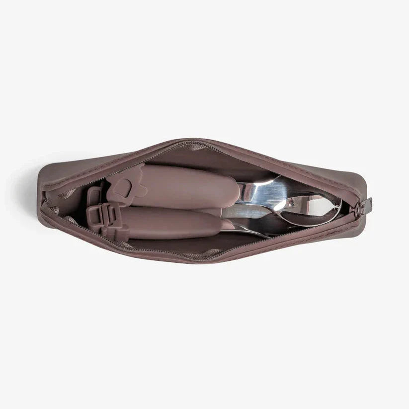 El juego también incluye un estuche de silicona para guardar los cubiertos cuando se sale de casa, lo que facilita mantenerlos ordenados e higiénicos.