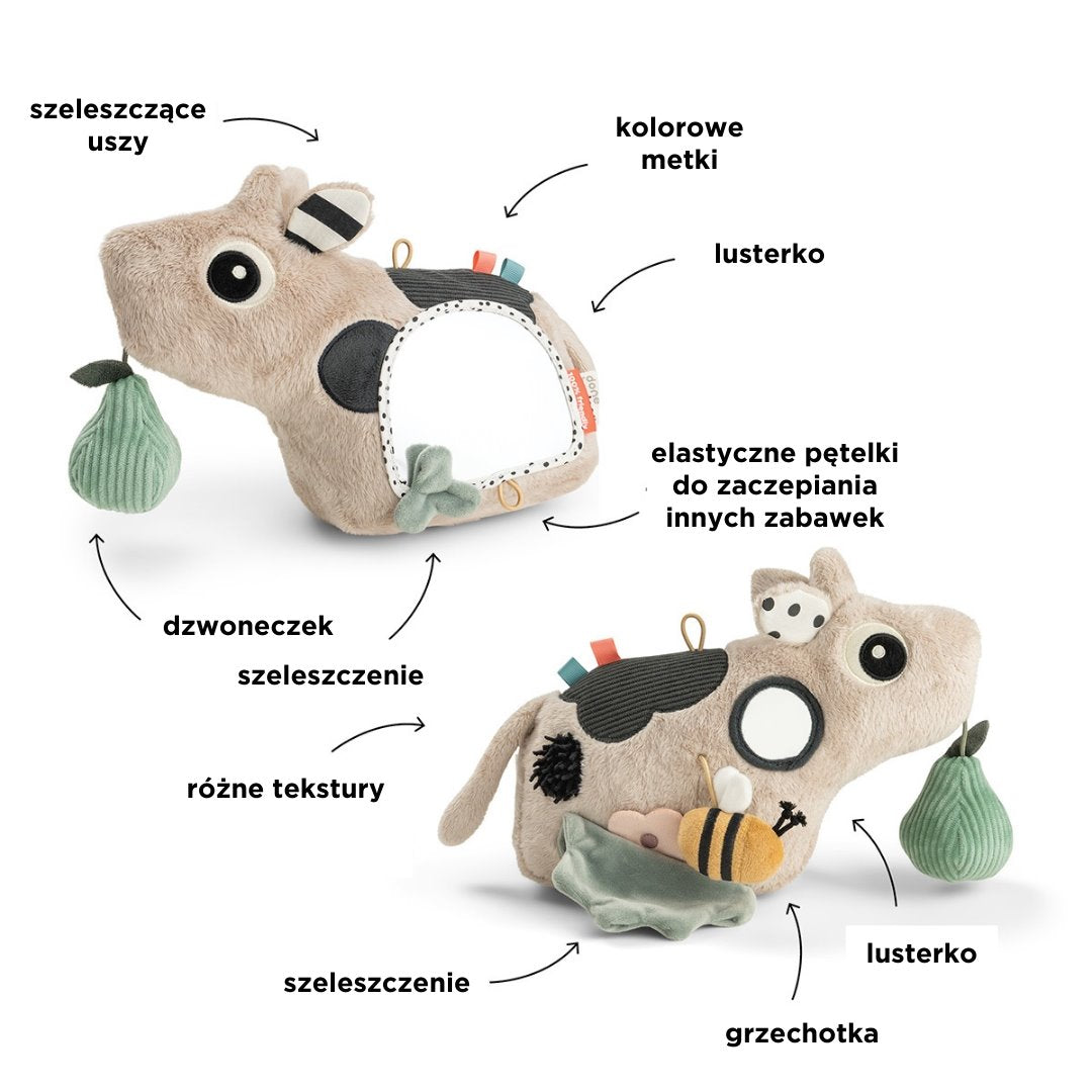Este modelo de Done By Deer está equipado con colgantes de colores, diferentes texturas y elementos crepitantes y sonoros que estimulan los sentidos e invitan a la exploración.