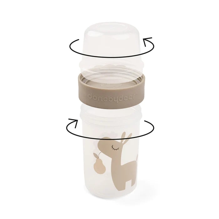 Te permite guardar dos meriendas diferentes al mismo tiempo. Solo tienes que meterlas en el recipiente hermético Done by Deer y hacer feliz a tu pequeño.