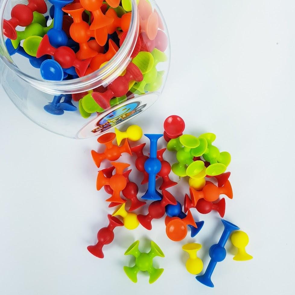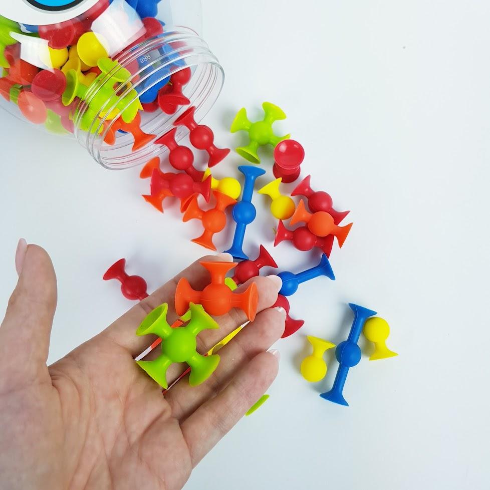 Las fantásticas mini ventosas de silicona de Fat Brain Toys son flexibles y muy maleables, se adhieren entre sí y a cualquier superficie lisa.